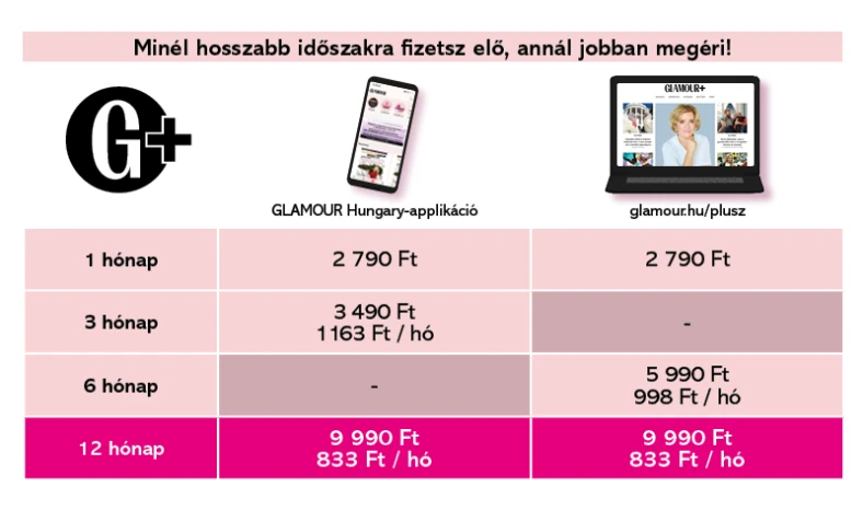 A GLAMOUR Plusz a glamour.hu hivatalos, fizetős szolgáltatása. Az előfizetés korlátlan hozzáférést biztosít a glamour.hu/plusz oldalán és a GLAMOUR Hungary-alkalmazásban található összes tartalomhoz. Bármelyik platformon fizetsz elő, azzal használhatod a másik felület fizetős szolgáltatását is, így amennyiben a weben és az appban egyaránt szeretnéd használni a GLAMOUR Pluszt, úgy nem szükséges mindkét felületen előfizetned.