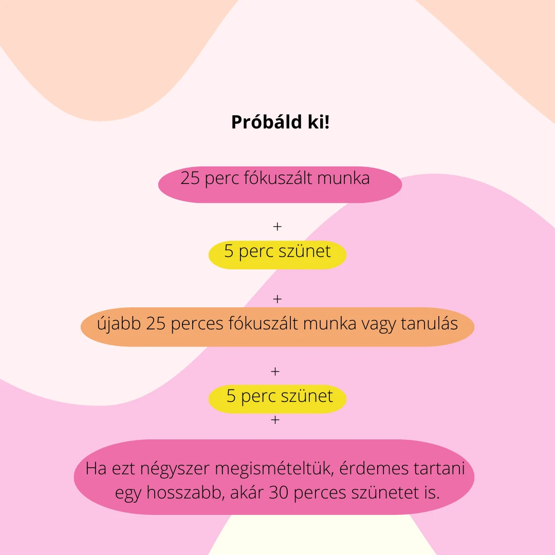 - A 25 perc elteltével tarts 5 perc szünetet! Nyújtózz egyet, készíts egy csésze teát vagy kávét, vagy sétálj egy kicsit.