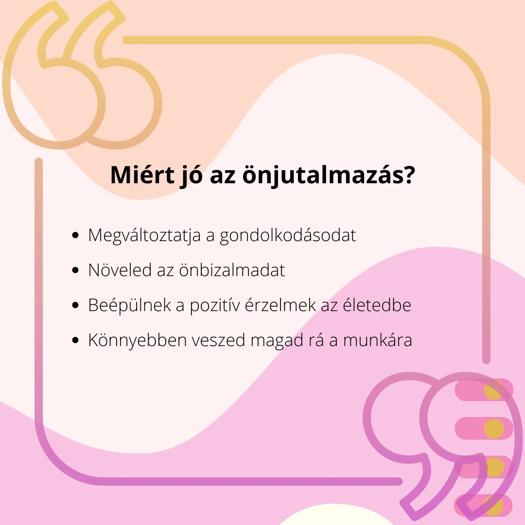 - Gamification, avagy játékosítás: A legjobb módja az önjutalmazásnak az, ha úgy tekintesz rá, mint egy videójátékra. A videojátékok azért olyan addiktívak, mert az egyes kihívások vagy szintek során azonnal visszacsatolást kapsz, hogy jól teljesítettél-e vagy sem. Ha igen, be is gyűjtheted a jutalmakat. Az önjutalmazás megváltoztatja a gondolkodásodat. Mi lenne, ha te is játékosítanád az életedet? Azáltal, hogy az önjutalmazást beépíted a mindennapjaidba, növelheted az önbizalmadat és beépítheted a pozitív érzelmeket az életedbe. Ha tudatosan alkalmazod az önjutalmazást, észre fogod venni, hogy lelkesebb vagy, többet cselekszel és könnyebben rá is veszed magad a cselekvésre. Gondolkodj el azon, hogy ha az életed a kedvenc játékod lenne, akkor miben lenne más? Hogyan tudod kedvenc társas- vagy videójátékod elemeit megteremteni az életedben? Hogyan játékosíthatod az életed? Milyen jutalmak lennének életed játékában? Játssz el a gondolattal és tedd szórakoztatóbbá a mindennapjaidat!