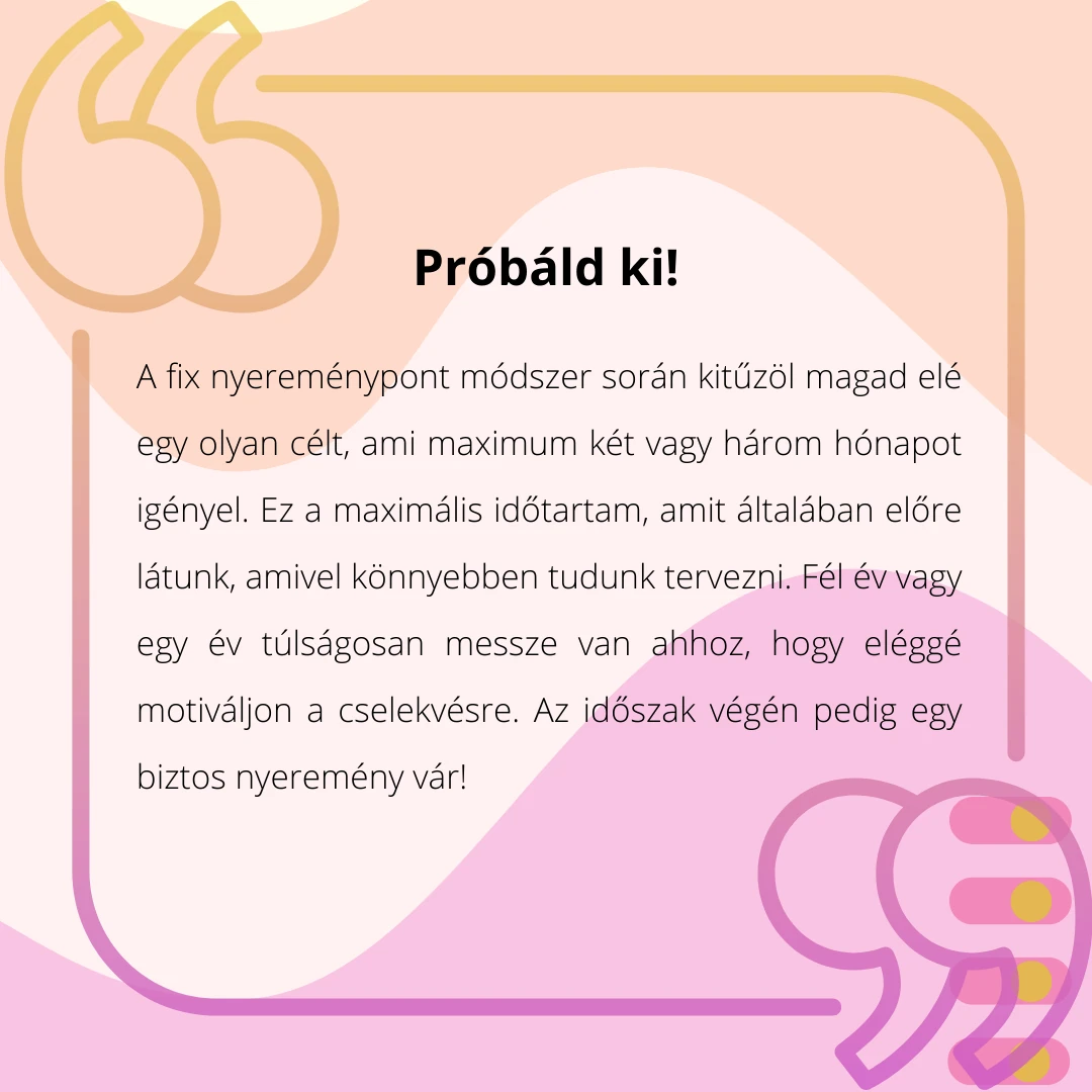 - A fix nyereménypont elmélet: Az önjutalmazás egy másik módját személy szerint fix nyereménypont elméletnek neveztem el. Ez annyit jelent, hogy a teljesítményeddel és az eredményeiddel arányosan előre megtervezheted, mivel jutalmazod magad. Ezt a technikát számos sikeres vállalkozó is alkalmazza, hogy megteremtse a szükséges motivációt és cselekvésre ösztönözze magát. A fix nyereménypont módszerem során kitűzöl magad elé egy olyan célt, amely eléréséhez maximum két vagy három hónapra van szükség. Két-három hónap az a maximális időtartam, amit általában előre látunk, amivel könnyebben tudunk tervezni. Fél év vagy egy év túlságosan messze van ahhoz, hogy eléggé motiváljon a cselekvésre. Az időszak végén pedig egy biztos nyeremény (fix vagy rögzített nyeremény) vár. Ez lehet egy utazás egy vágyott desztinációra vagy egy konkrét esemény, amire nagyon vágysz. Bármi is legyen az, 100%-ban biztos vagy benne, hogy egy pozitív eseményt fogsz megtapasztalni az adott, fix időben és ez mérhetetlenül nagy örömet okoz neked. Ehhez előre is megveheted a repjegyeket, de az is lehet, hogy találkozol valakivel, aki fontos a számodra az adott időpontban, vagy a szülinapod dátumáról vagy a közelgő bónuszosztásról van szó. Lényeg a lényeg, valami nagyszerű vár rád rövid időn belül, és ezért motiválva, még nagyobb erővel tudsz fókuszálni és dolgozni a céljaidon, hogy úgy érezd, jól megérdemelt a siker. Ez a technika különösen hasznos akkor, ha tornyosulnak előtted a tennivalók és extra hajtóerőre és fókuszra van szükséged.