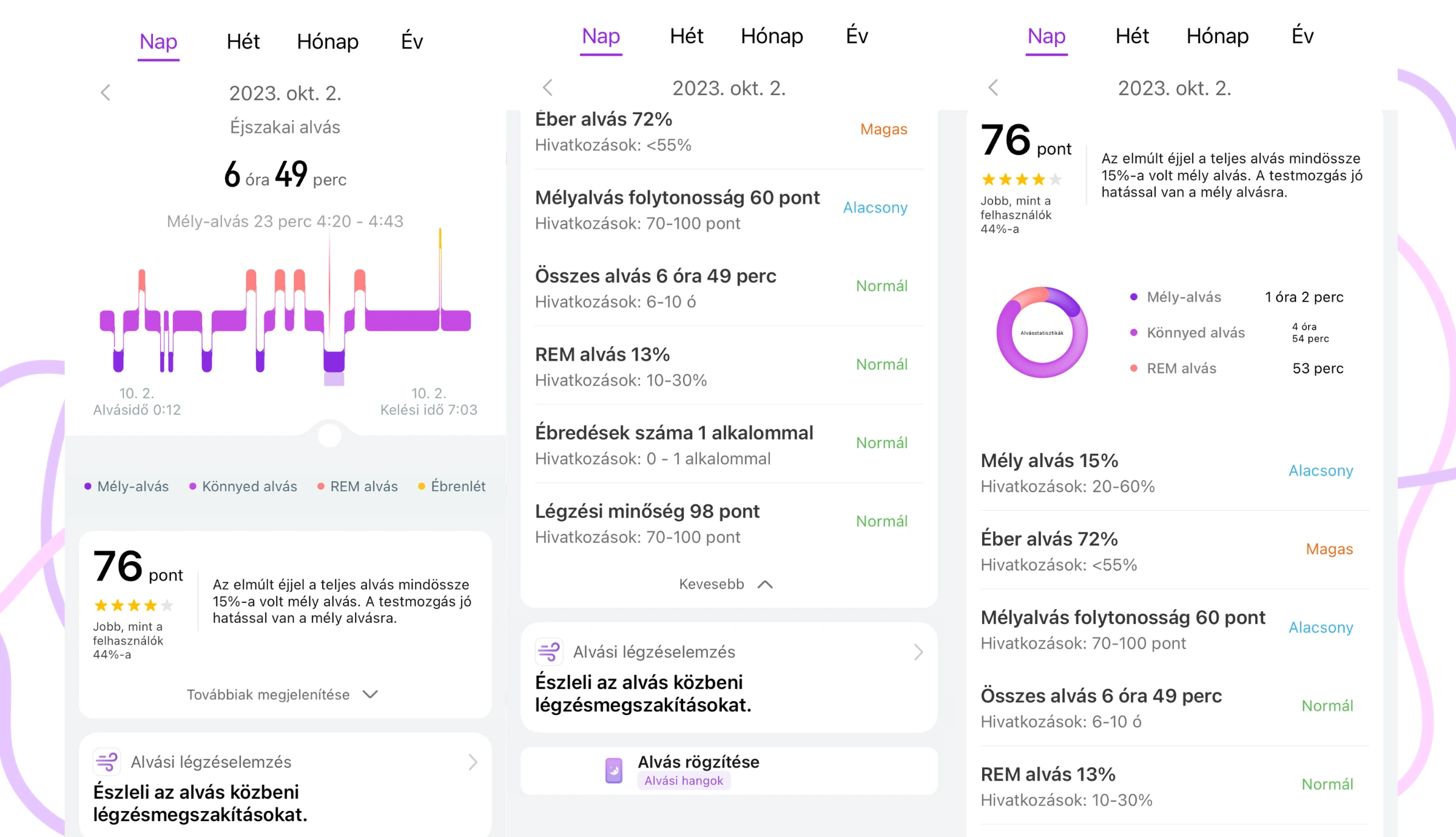 Mi lenne, ha azt is tudnád, hogy az alvás során hogyan változott a légzésed, mennyi időt töltöttél mély alvási fázisban és ez elegendő pihenést biztosított-e számodra? Nos, a HUAWEI TruSleep™ 3.0 monitorozási rendszere figyeli az alvás minden pillanatát. Képbe kerülhetsz olyan infókkal is, mint hogy mennyi időt töltöttél a REM szakaszban, mély- és könnyed-alvásban, és hogy hányszor ébredtél fel alvás közben. Sőt, az óra érzékeli a rendellenes légzést is, ami segít felismerni az alvási apnoe jeleit. Hogy könnyebb legyen számodra az adatok értékelése, a különböző minőségi szempontokra (például éber alvás aránya, mélyalvás folytonosság, légzési minőség) külön és együttesen is pontszámot kapsz.