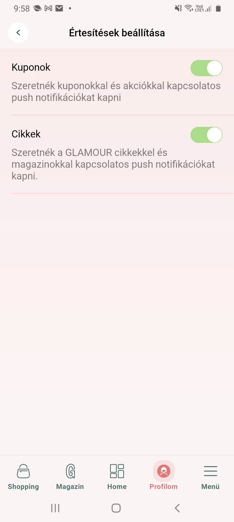 A "Profilom" menüpontban könnyedén be tudod kapcsolni az értesítéseket, csupán ellenőrizned kell, hogy a csúszkák zöldre vannak állítva: