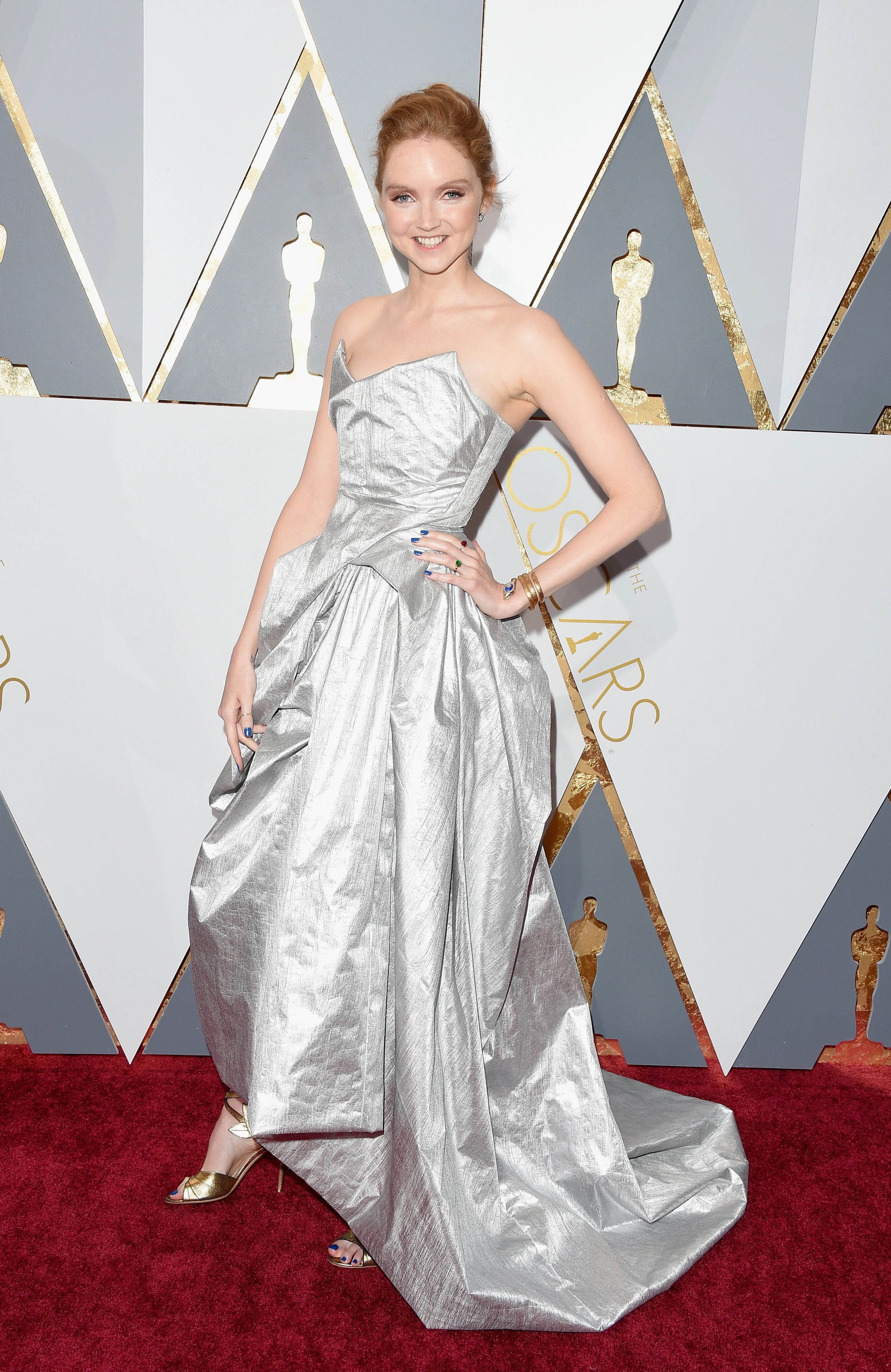 Lily Cole színésznő a 2016-os Oscar-gálára egy ezüst Vivienne Westwood ruhát választott, amely újrahasznosított műanyag palackokból készült.