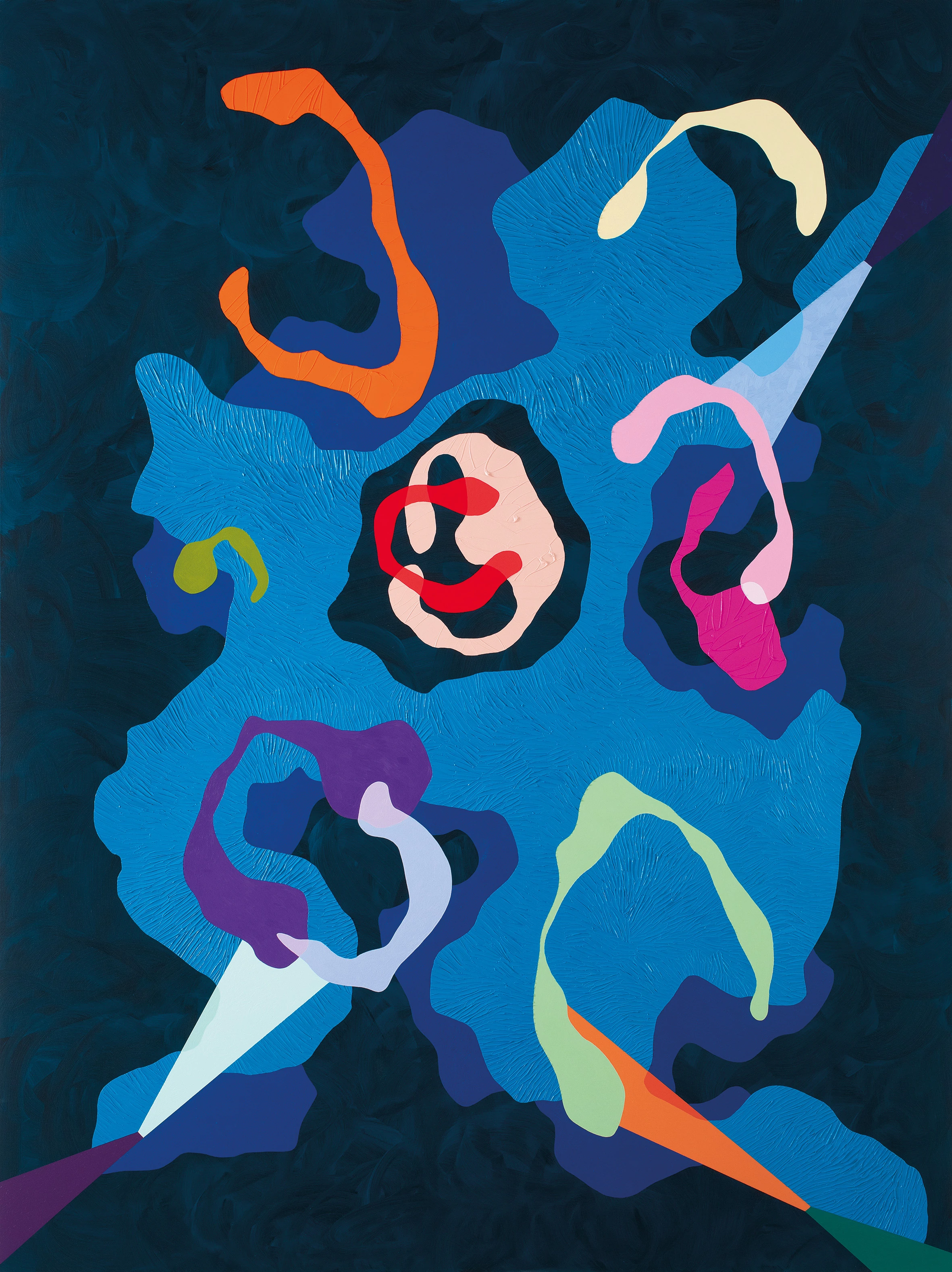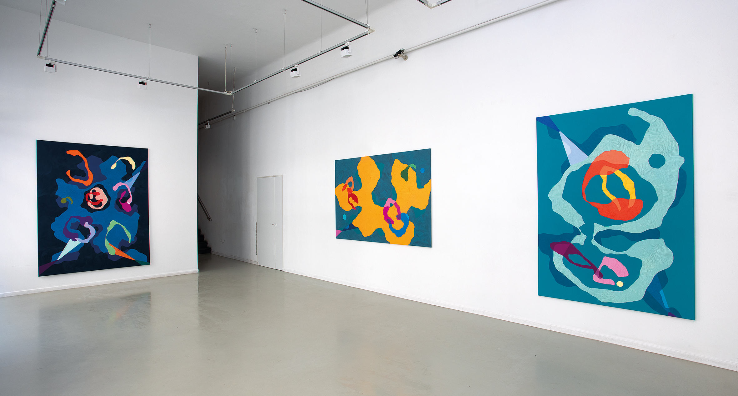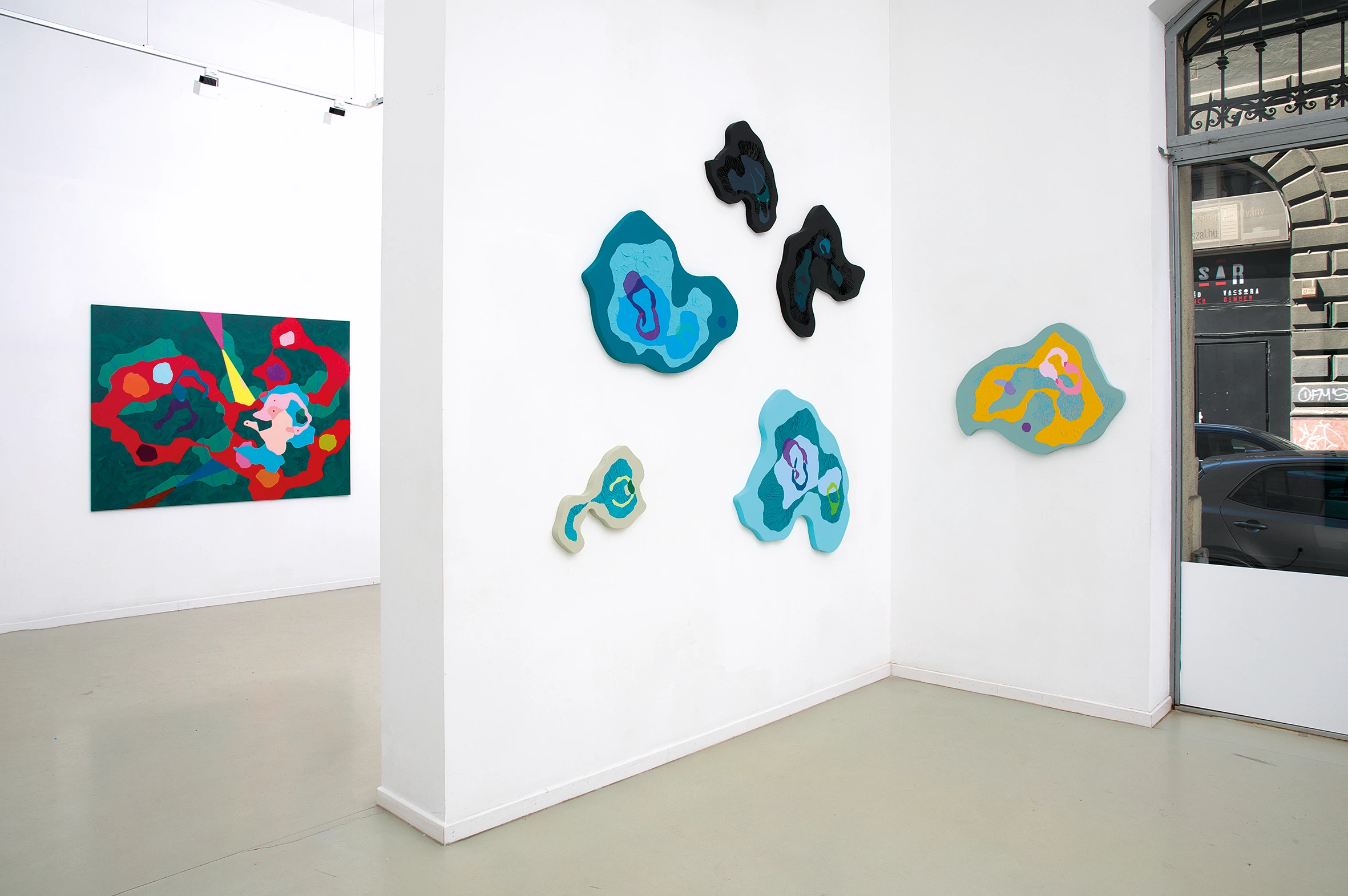 A felhők súlya című tárlaton a nagy méretű vászon képek mellett 10 síkplasztikát is kiállítottam. Ezek az organikus formák - A felhők - olyanok, mintha a képeim egy-egy részlete lenne kiemelve és tovább festve. Mindig érdekelt a térbeliség kérdése, akár a sík vásznon, akár kilépve a három dimenzióba. A most bemutatott anyagban dominálnak a kékek, ugyanakkor az erős színkontrasztokkal bemutatott organikus és geometrikus elemek hol mozgalmas, hol nyugodt hangulatot jelenítenek meg.