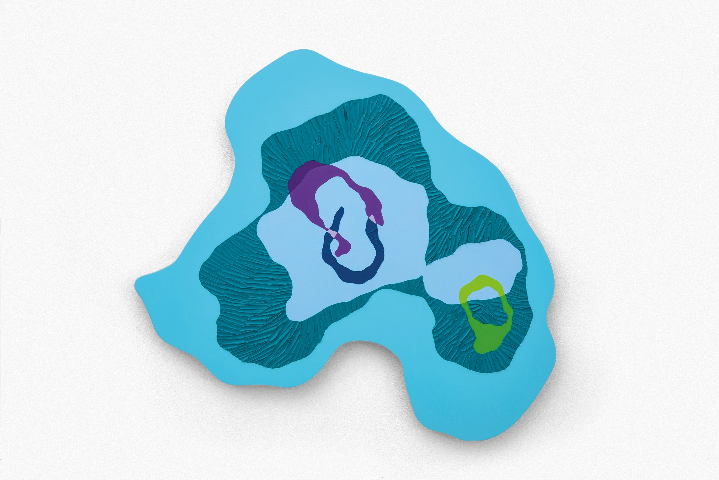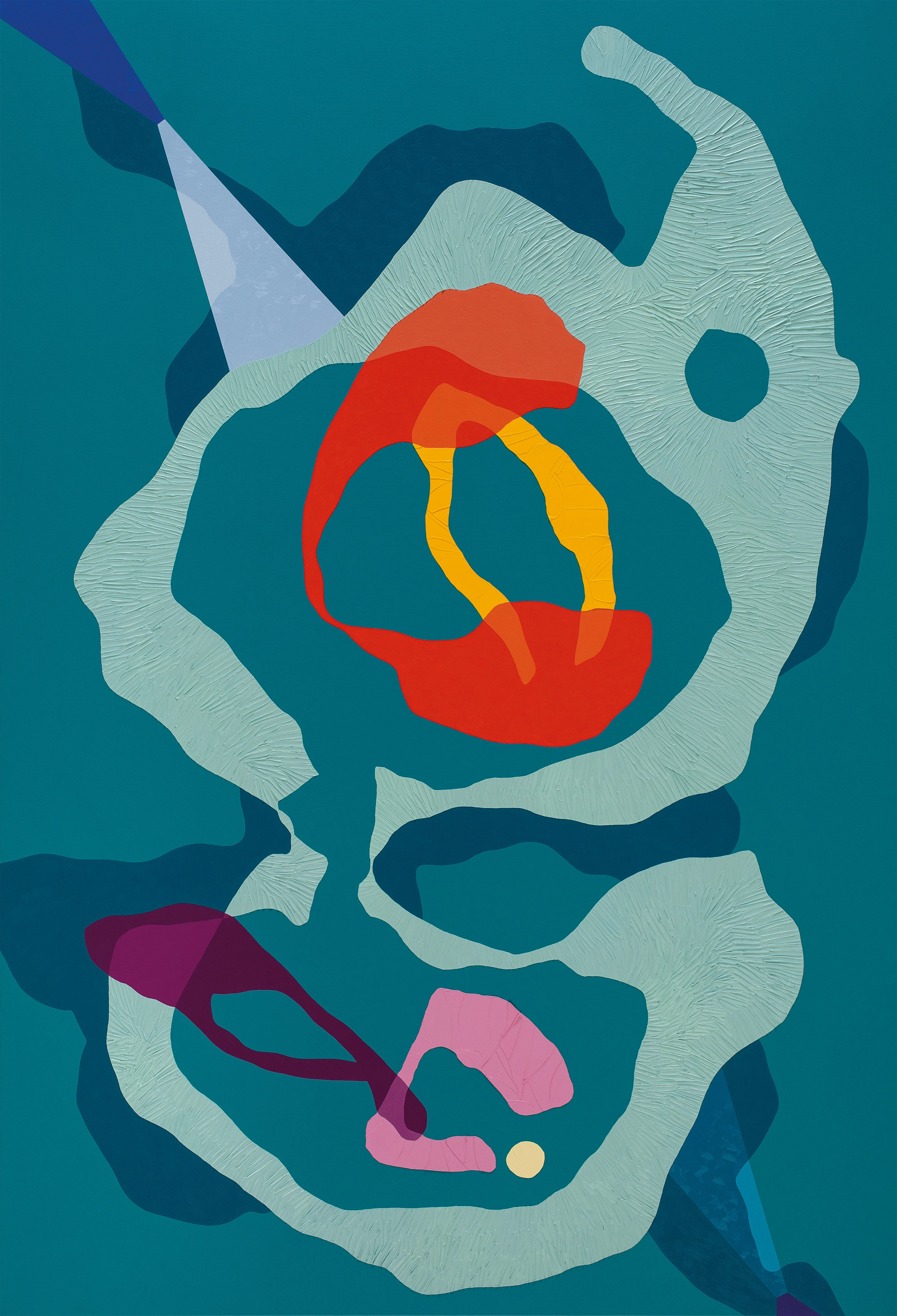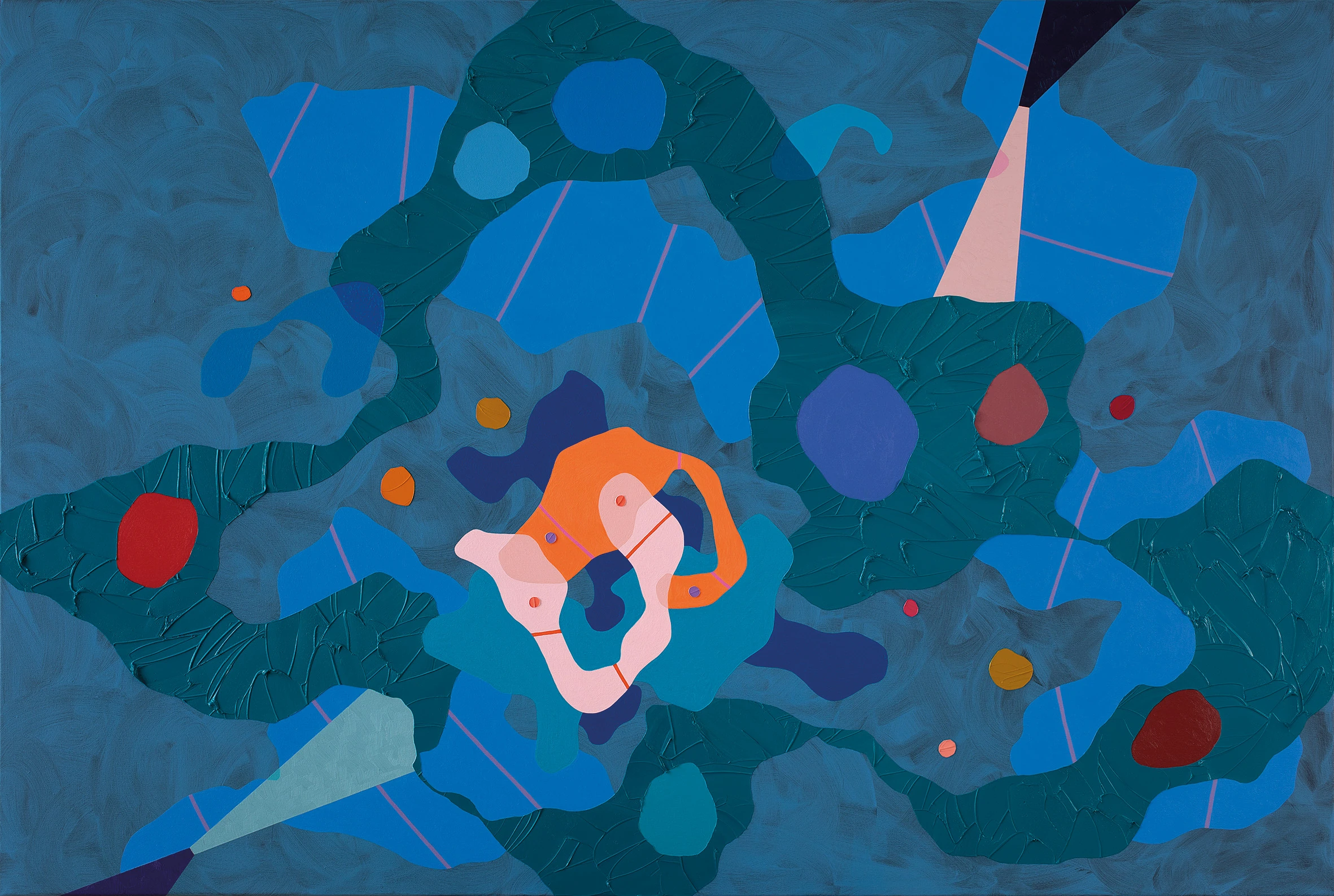 A felhők súlya című tárlaton a nagy méretű vászon képek mellett 10 síkplasztikát is kiállítottam. Ezek az organikus formák - A felhők - olyanok, mintha a képeim egy-egy részlete lenne kiemelve és tovább festve. Mindig érdekelt a térbeliség kérdése, akár a sík vásznon, akár kilépve a három dimenzióba. A most bemutatott anyagban dominálnak a kékek, ugyanakkor az erős színkontrasztokkal bemutatott organikus és geometrikus elemek hol mozgalmas, hol nyugodt hangulatot jelenítenek meg.
