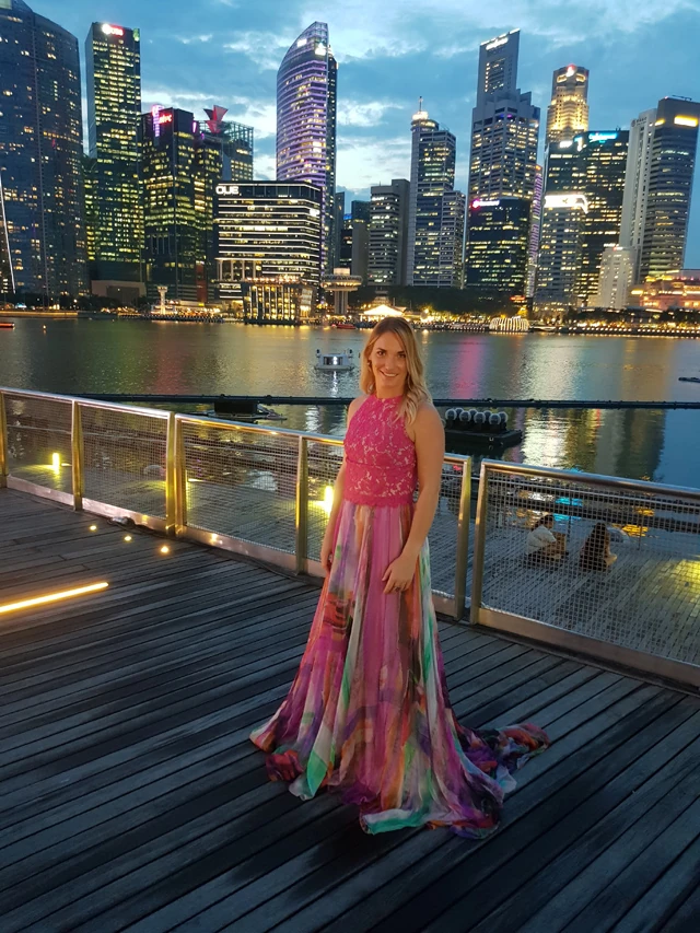 Babos Tímea a szingapúri nyitógálán Benes Anita ruhában, amivel kiérdemelte az este legjobban öltözöttje címet: