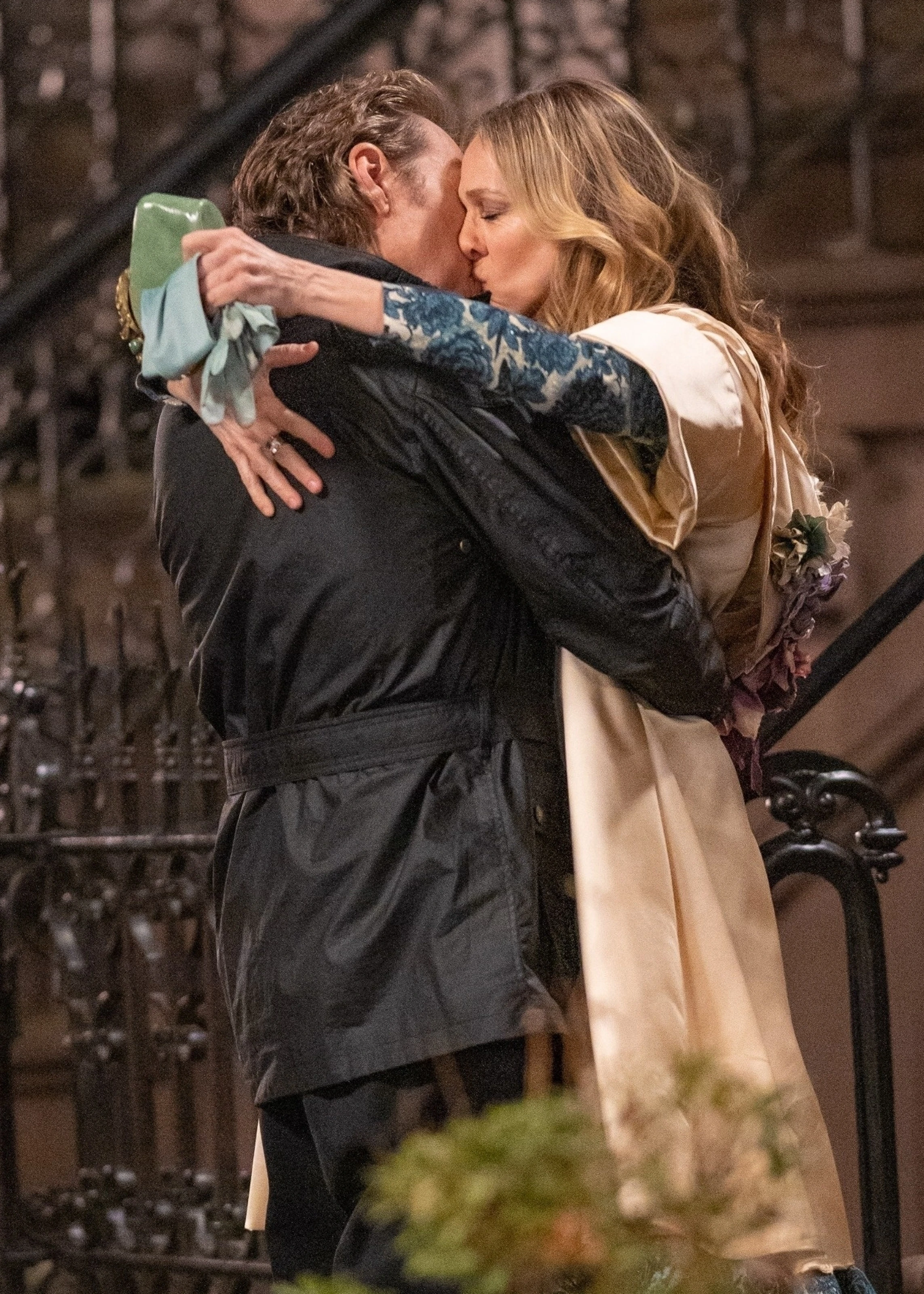 Fotón, ahogy Carrie Bradshaw szenvedélyesen csókolózik Aidannel az And Just Like That folytatásában