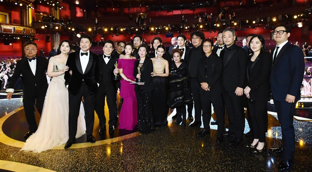 Az Élősködők stábja az Oscar-díjátadó színpadán: