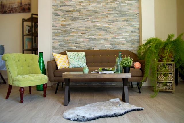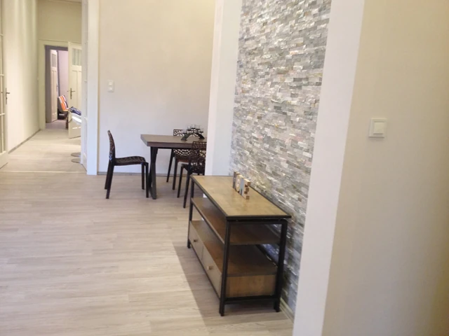 Félkész állapotban leledzik a már említett nappali-étkező. Itt már fenn van a terméskő borítás a nappali falán és kész a padló.