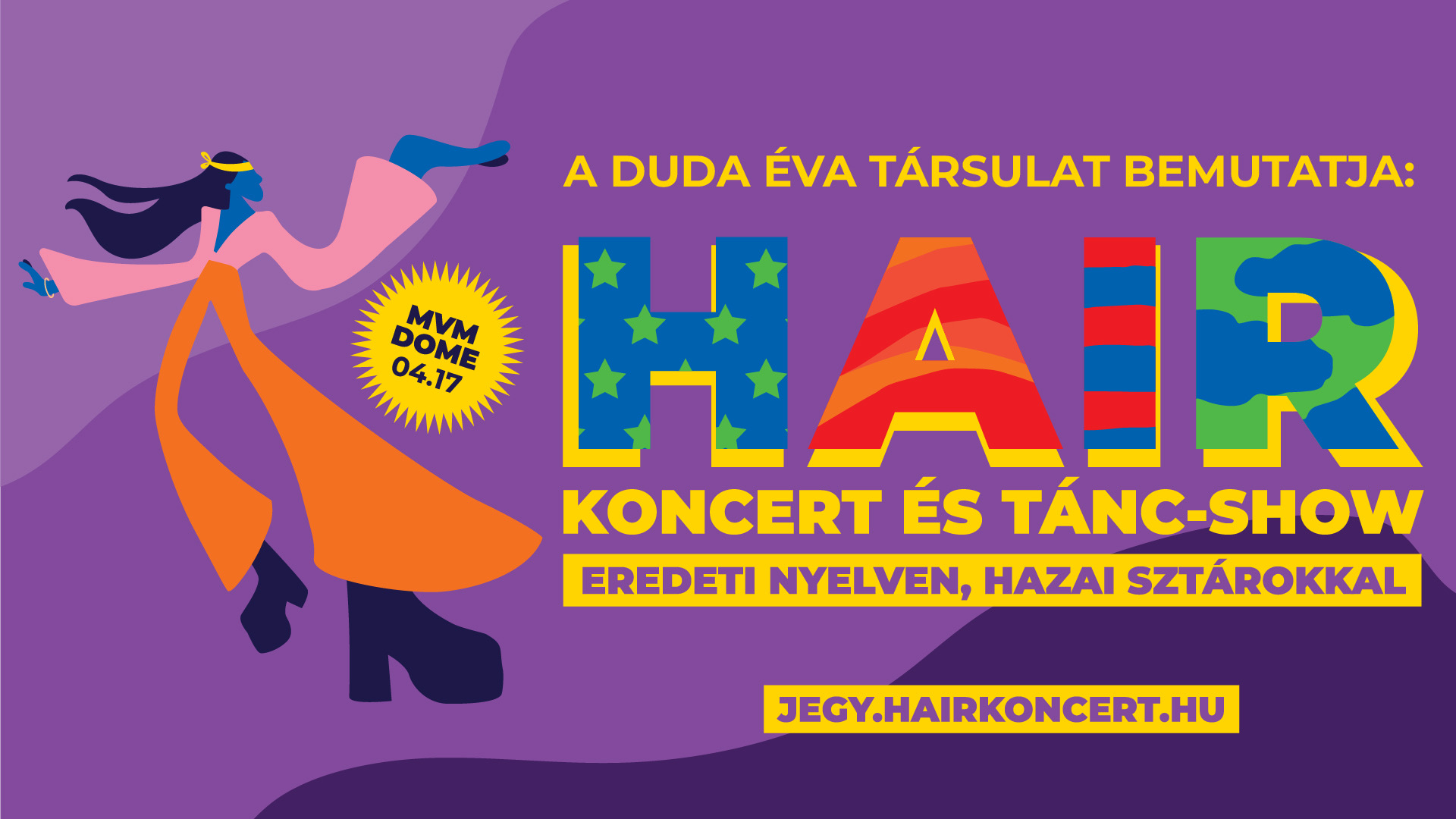 Az MVM Dome színpadán, április 17-én rendezik meg azt a látványosnak ígérkező koncert- és tánc-show-t, amelynek alkalmával a kultikus HAIR című film világhírű számai először csendülhetnek fel eredeti nyelven Magyarországon, mégpedig hazai sztárok tolmácsolásában, élő zenével, izgalmas koreográfiákkal és látványvilággal kísérve.