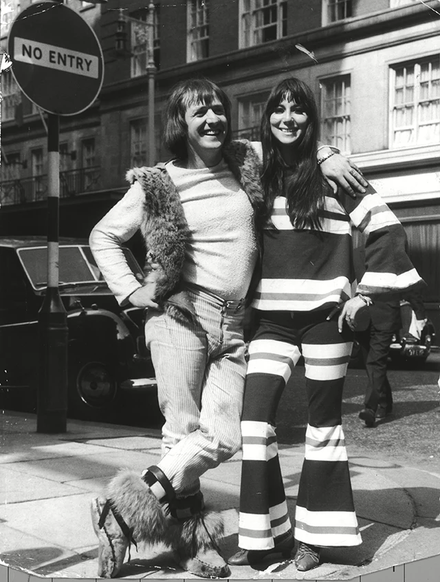 Itt ismerkedett meg későbbi férjével, előadótársával, Sonny Bonóval. Cher eleinte klubokban táncolt, majd Sonny kapcsolatainak köszönhetően háttérénekes lett, és hamarosan eljutott az első kislemezig (Ringo, I Love You), ami nem aratott különösebb sikert. Sonny azt akarta, hogy barátnője szóló koncert karrierbe kezdjen, de Cher annyira izgult a színpadon, hogy Sonny nélkül nem lépett fel. Megalakult hát a Sonny & Cher duó. Már 1965-ben járunk, ekkor vették fel a hamarosan világhírt hozó I Got You Babe című dalukat, majd Londonba utaztak. A Rolling Stones tanácsára tették, akik azt mondták nekik, hogy az amerikaiak nem igazán vevők rájuk, és ha igazi sikert akarnak Angliában érdemes próbálkozniuk. (Ne feledjük, ekkoriban Anglia volt a pop-rock zenei nagyhatalom.) Megérkezésükkor újságírók hada fotózta le őket – főleg különc outfitjük miatt – és gyakorlatilag egy nap alatt sztárok lettek. Az I Got You Babe slágerlista vezető lett, a brit listák éléről még a Beatlest is letaszították egy időre. Az angol tinik megőrültek a stílusukért, ami teljesen egyedi volt, nem hasonlított a londoni divatra. A trapéznadrág, szőrmemellény, fodros ing, csíkos holmik, indián tunikák lavinaszerű elterjedése az amerikai duónak volt köszönhető.