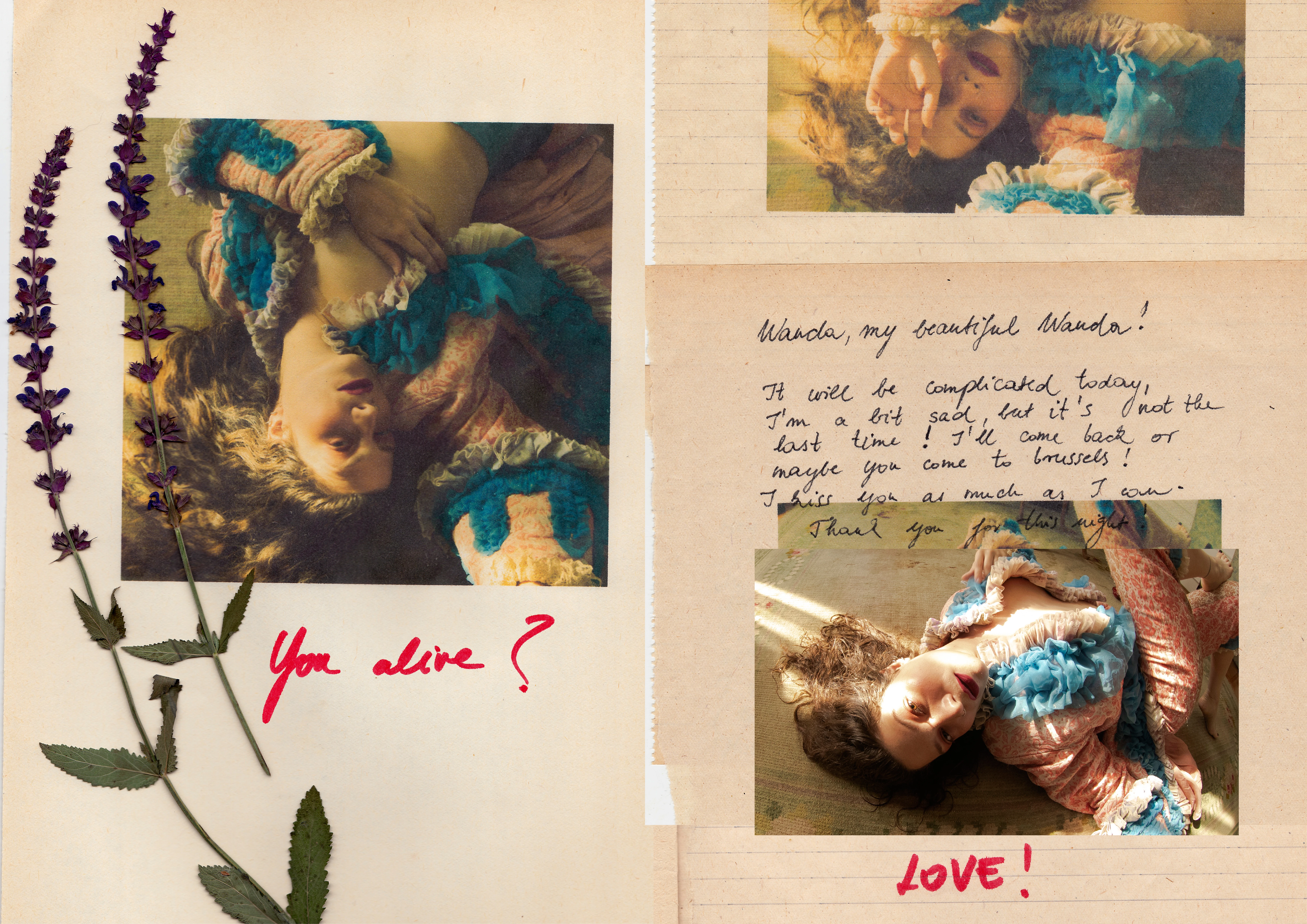 A külön teremben az anyag számomra nagyon személyes, a karantén alatt kezdtem el, amikor még Londonban voltam egyedül a lakásban, közben éppen egy szakításon mentem keresztül. Utoljára tizenhat évesen, amikor önarcképekkel tanultam a fotózást, fordítottam magam felé a kamerát, saját magam modellje lettem. Kicsit egy művészetterápiás eszközzé vált nekem a projekt, miközben fotóztam párhuzamosan egy pszichológussal is elkezdtem beszélni online. Az önmagamon dolgozás fontos része volt a folyamatnak, pár helyen konkrét parafrázisként, máshol indirektebben utalok olyan 19. századi romantikus festményekre, amelyek szíve törött hősnőket ábrázolnak, akiknek a szerepébe én is belehelyeztem magam. A kollázshoz felhasznált szövegek egy része volt barátoktól, szerelmektől vagy Tinder randiktól kapott, néha vulgáris üzenetek voltak; a scannelt oldalak pedig a tinédzserkori kedvenc regényeimből való szerelmi leírások, többek között az Üvöltő szeleket, az Ifjú Werther szenvedéseit, a Mester és Margaritát, a Vörös és Feketét és az Anyegint használtam fel. Számomra ezek mutatják be azt az idealizált szerelmet, ami szerintem sok más nő fejében is él. Ezt a romantikus szerelmi ideát és elképzelést ütköztettem a valóságos tapasztalataimmal.