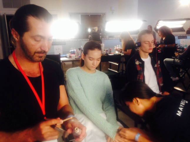 Volt szerencsénk ugyanis bekukkantani a színfalak mögé, hiszen ezen a show-n is a Maybelline volt a sminkfelelős, és innen sem hiányozhatott a márka magyar sminkmestere, Larion Oscar, aki munka közben beavatott minket a készülő make-up titkaiba. Tőle tudtuk meg, hogy Grace Lee, a Maybelline sminkgurujaként a Public School kollekciójához városi katonákat álmodott meg. Ez a gyakorlatban annyit tett, hogy egy olyan smink készült, ahol kifejezetten a szemen volt a hangsúly, olyannyira, hogy ezúttal mellőzték a pirosítót és a kontúrozást is a légies, friss hatás elérése érdekében. Larion Oscar elárulta nekünk, hogy a smink kulcsterméke a Maybelline Dream Wonder alapozója volt. A szem hangsúlyozását a tusvonal adta, amelyet most nem húztak meg, hanem az intenzívebb hatás kedvéért ecsettel vitték fel.