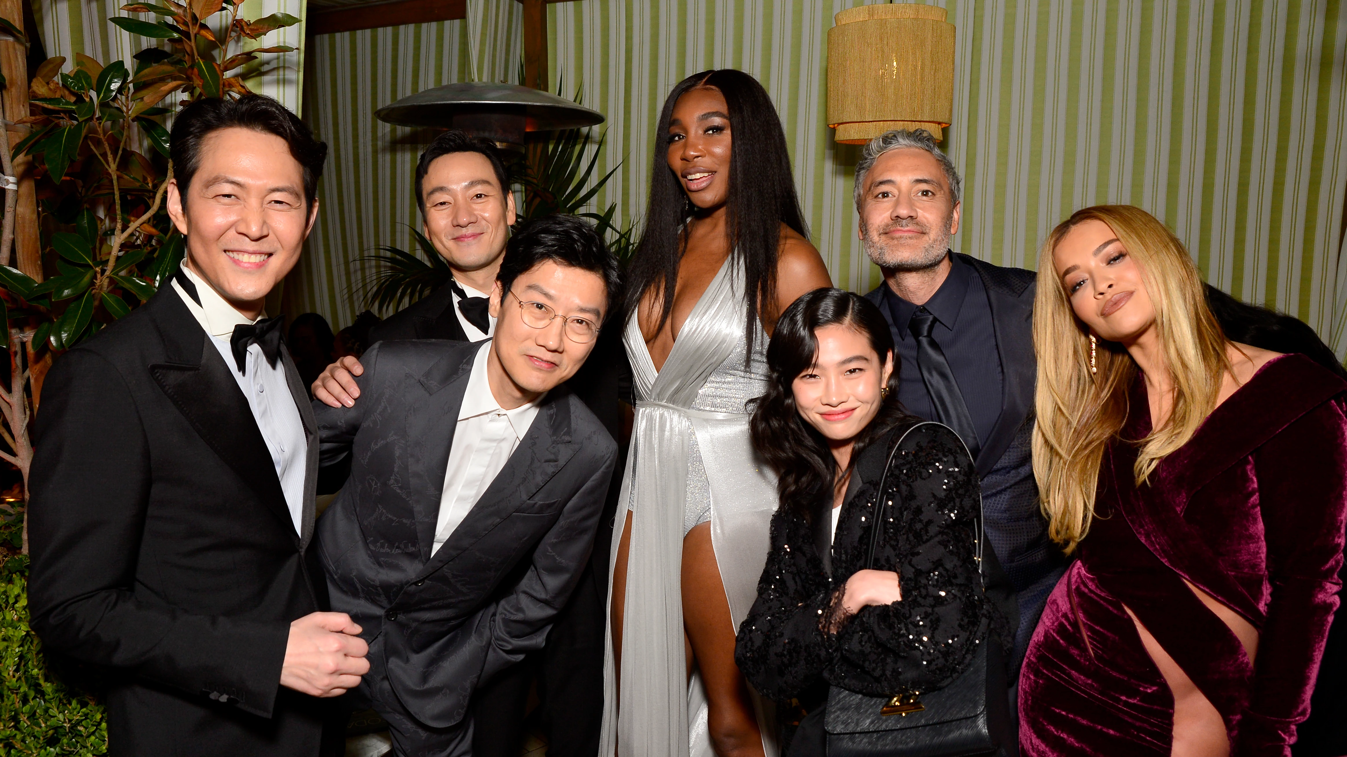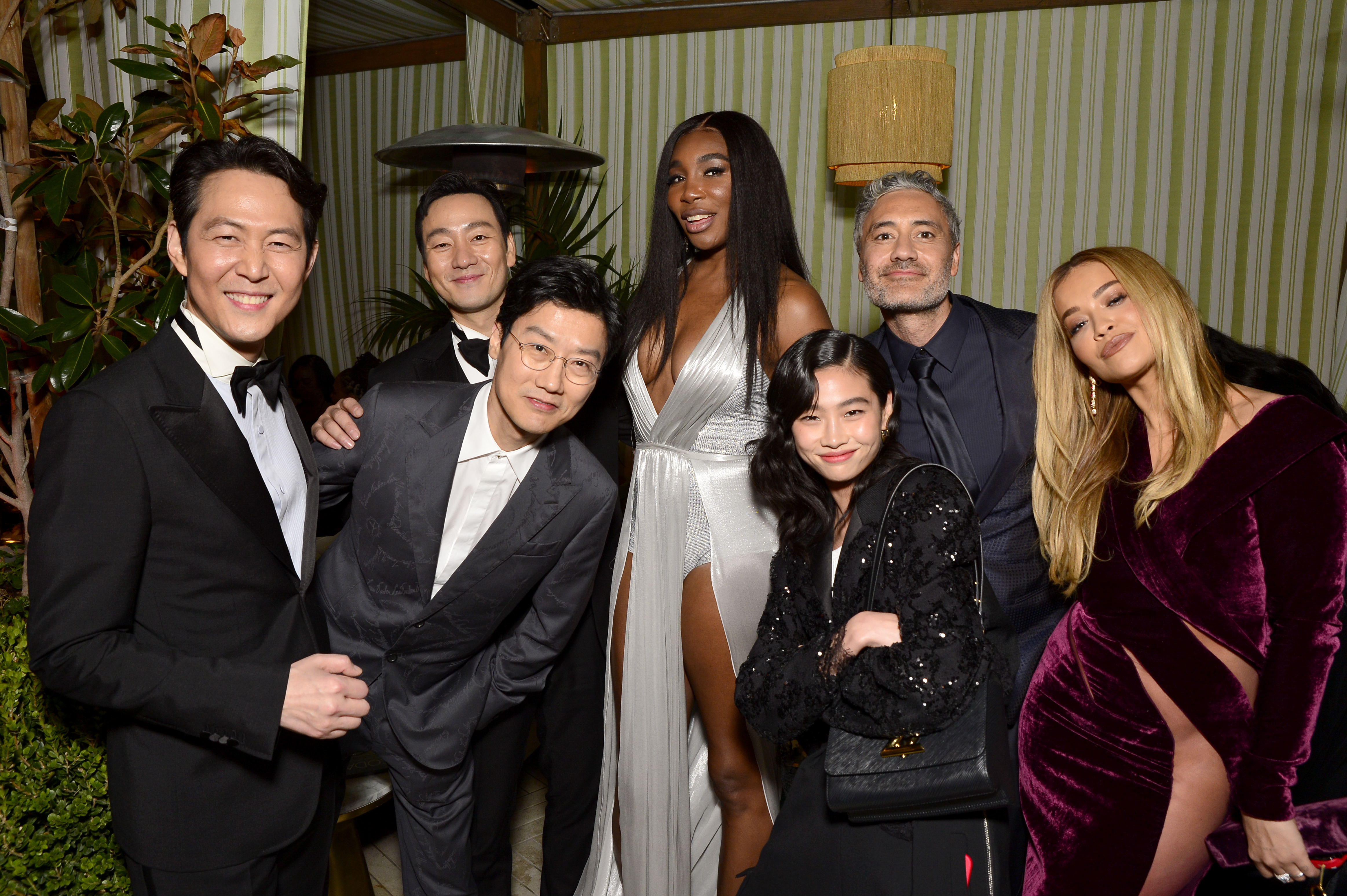 Az ‘est’ már délután két órakor megkezdődött, akkor nyitották meg a hatalmas vörös szőnyeget a hotel előtt. Mi, a házigazda újságírók, nem is vonulhattunk végig (fogózkodni azért lehetett), mert annyi világsztár jelent meg, hogy így is alig tudták nekik biztosítani az egy percnyi önálló fotózást. Azért azt érdekes volt testközelből látni, hogy Serena Willams, Venus Williams és Jerald Leto úgy álltak szépen, fegyelmezetten sorban a tömegben, mint ahogy a táncos klubok előtt szoktak várakozni a vendégek LA-ben egy szombat esti buli előtt… Kétségtelenül Yung Ho Yaon, a dél-koreai modell, a kétszeres Critics Choice nyertes Squid Game színésznője keltette a masszív celeb-tömegben a legnagyobb feltűnést ruhájával, gyakorlatilag úgy nézett ki, mint egy kecses barokk csillár, a pufándlis, óarany, rojtokkal dísztett, csillámló ruhájában. Egyébként feltűnően sok sztár viselt világos, fehér, bézs, arany vagy kövekkel díszített estélyit. Az egyik legklasszikusabbat közülük Kristen Stewarton láttam, akit közvetlen közelről is megcsodálhattam, mert mellettem hagyta el a vörös szőnyeget.