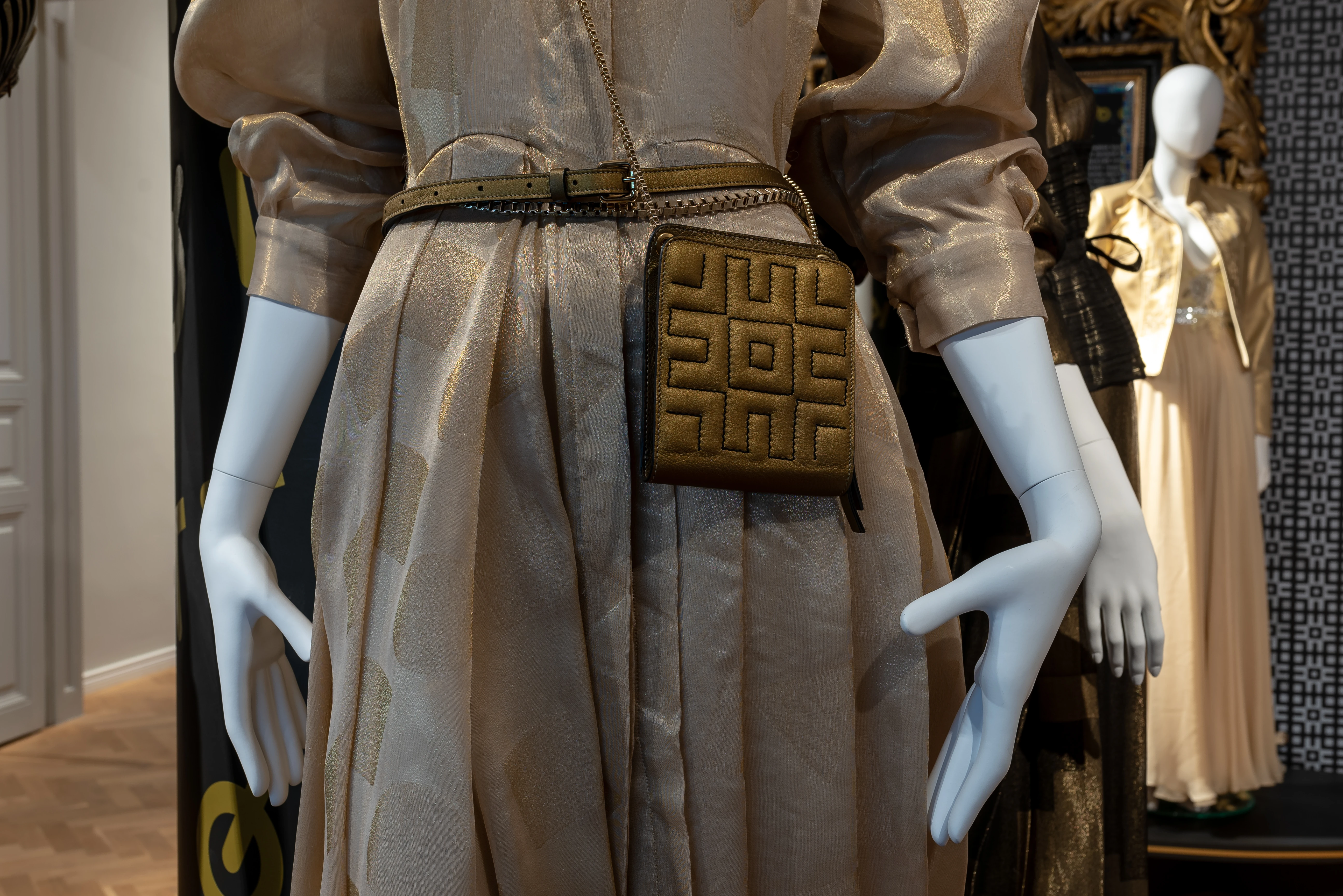 A további termekben a három egyetemes európai, fősodrású szecessziót mutatjuk be: a brit, az osztrák és a francia szecessziót. Ott egy kicsit más a megközelítés, a színvilágnak ott is komoly szerepe van, de a briteknél például egy nagyon egyszerű fehér ruha került az enteriőrbe, ami egy kicsit azt sugallja, hogy a brit művészetben a praktikum is szempont volt. Ugyan az angol művészek a szecesszióban is megőrizték az erőteljes középkori hagyományokat, de a praktikumot mindig szem előtt tartották. A középső teremben található ruha egy az egyben sugallja az osztrák művészet lényegét. Most nem Klimtre gondolok, hanem az iparművészeti tevékenységükre és a grafikákra, ahol az egyszerű piramis, vagy két dimenziós vonalakból kialakított díszítmények láthatók, és a Wiener Werkstätte monogramjára, a dupla W-re. Zoób Katinál a saját logója ugyanilyen fontos szerepet tölt be a teremben látható kasmír stólán. Ez a geometrikus logó első blikkre is nagyon megragadó motívum.