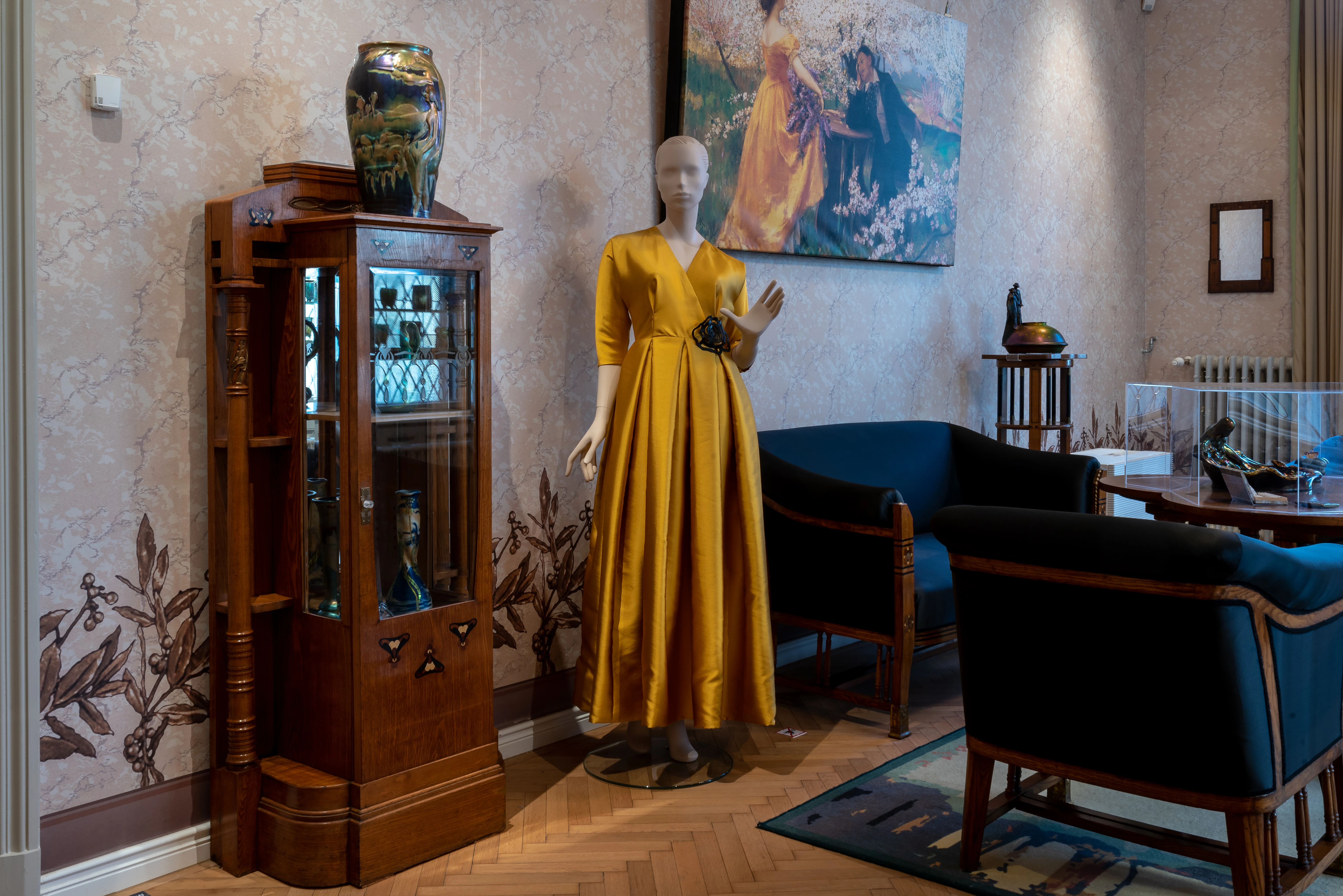 Az emeleten három terembe kerültek ruhák, a keleti teremben egy olyan ruha van, amely kicsit a keleti színvilágot is idézi, és az aszimmetrikus kompozícióval a keleti komponálásmódra utal vissza. Egy aranyló színvilág is megjelenik ezen a selyemruhán, ami viszont a közel-keleti spanyol kerámiák világát idézi meg. A magyar teremben egy rendkívül egyszerű ruha látható. Itt meg kell jegyezni, hogy a szecessziós időszakban az életmód is megváltozott, a nők elkezdtek dolgozni, sportolni, a fűzőt eldobták, és ha a gödöllői művészvilág tevékenységére gondolunk, ők nem csak művészek voltak, hanem egyfajta életstílust is képviseltek, ez az életstílus pedig azt jelentette, hogy már nem merev, lekötött nőként éltek, hanem szabadabb, úgynevezett reform ruhákat hordtak, amikben könnyebben tudtak mozogni. Katitól is egy ilyen ruha látható itt, ami teljesen szabad, finom darab, nagyon diszkrét, visszafogott díszítéssel.