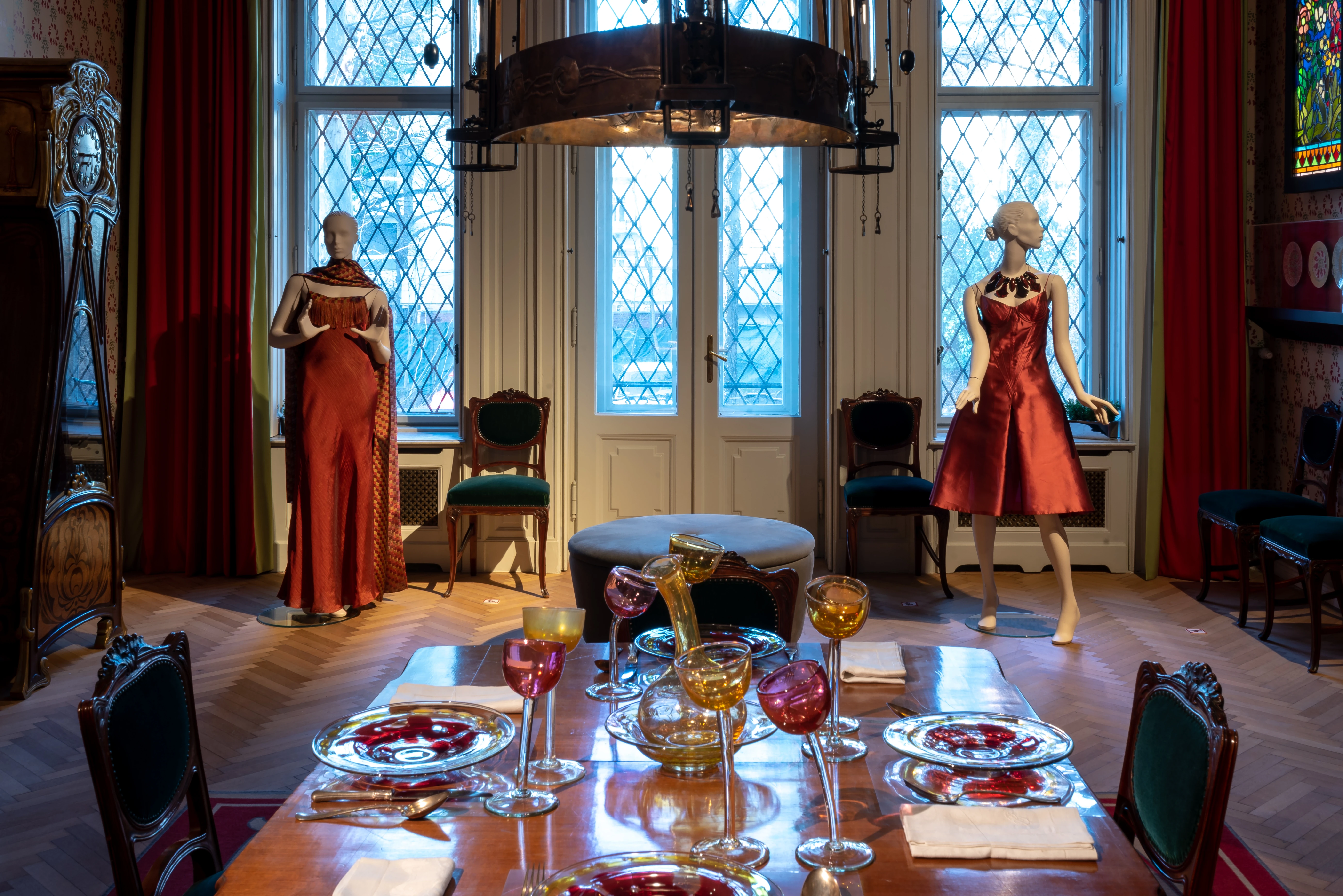 "Ezen túl pedig volt még egy másik indíttatás is, hogy kortárs művészeket is bevonjunk a kiállításba. Itt éppen a szecessziós ebédlőben vagyunk, ahol a megterített asztalon Pattanytús Gergely kortárs üvegművész alkotása látható, ő Rippl-Rónai alkotásait igen kedveli, de teljesen átgondoltan, más stílusban alkotja meg az üvegtárgyait, emlékeztetve Rippl Rónaira, de mégis saját stílusát megőrizve. A másik teremben szecessziós fogadószobában pedig Smetana Ágnes üvegtárgyai láthatók, aki szintén visszanyúlt a szecesszióig, nem csak a motívumokat, hanem a technikát illetően is. A harmadik ebben a sorban az volt, hogy két időszaki tervünk is van, amiben rendszeresen kortárs kiállítások láthatók, évente két alkalommal. Ez a kortárs designosztály projektje. A célja az, hogy a múzeumból kiválasztott tárgyból inspirálódva a művész kortárs művet hozzon létre, és így tulajdonképpen egész kézenfekvő volt, hogy ebbe a térbe Zoób Kati alkotásai is helyet kapjanak. Tizenkét ruha került az állandó kiállítás tereibe és tizenkettő pedig az időszaki terembe.