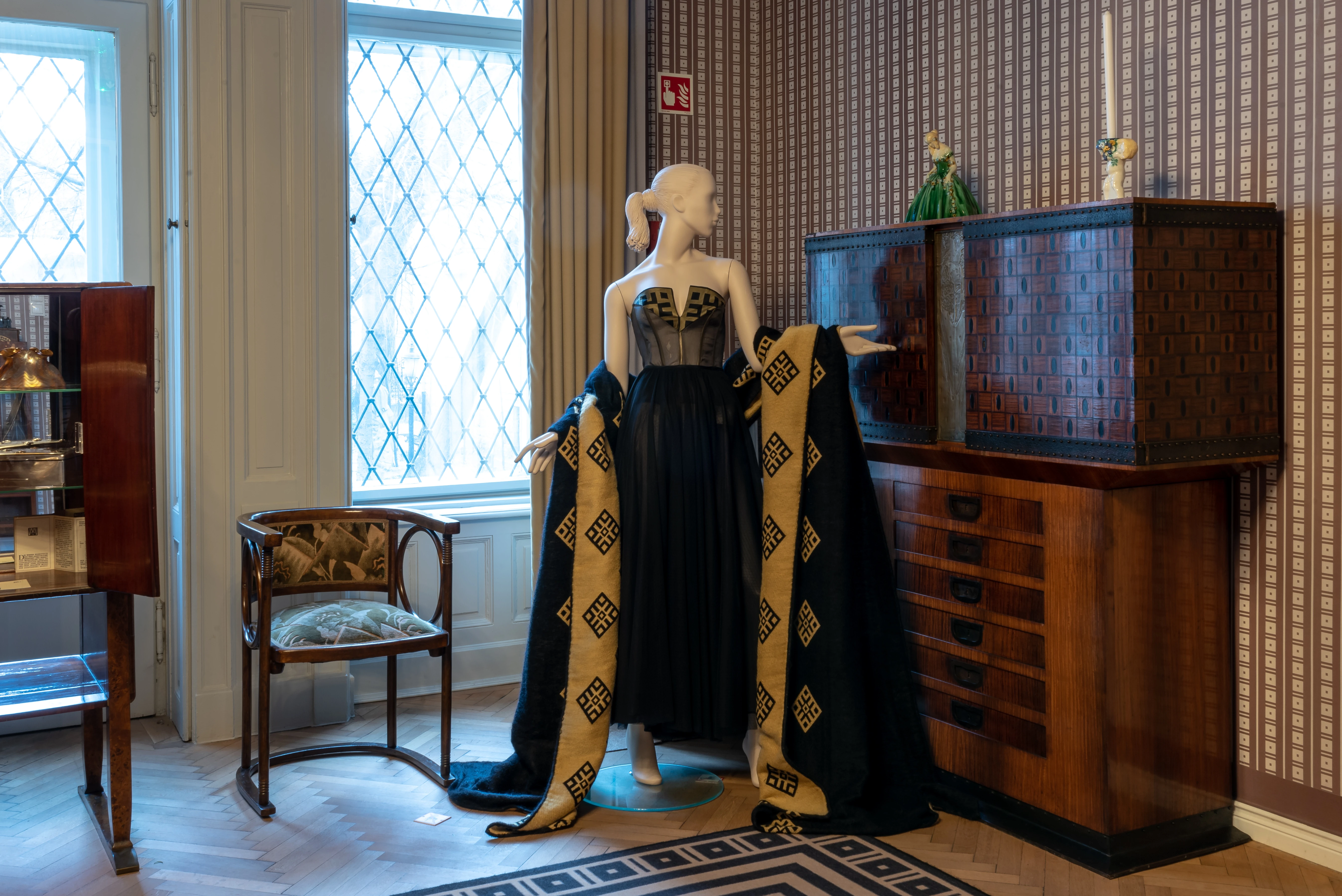 A gondolkodásmódja is köti a szecesszióhoz, vegyük akár a geometrizálást, akár a bizonyos minták átörökítését. A kiállított ruhák és tárgyak kiválasztása elég nehéz feladat volt olyan szempontból, hogy Katinak igen komoly életműve van, ahogy azt az életmű katalógusa is mutatja, rengeteg ruhát tervezett, igen sokféle stílusban. Igen sokszínű az életműve, mind a szabásmintákat, mind az anyagokat, mind a díszítményeket tekintve. Elsősorban az volt a cél, hogy az életműnek egy szeletét mutassuk be, egy múzeumi szemszögből, a szecesszióból, illetve a villa hangulatából kiindulva. Azokat a tárgyakat emeltük be az enteriőrbe, amelyek valamilyen módon beleillenek. A látogatók közül sokan úgy ítélték meg hogy olyan, mintha ezek az öltözékek eleve ide lettek volna teremtve. Nos, hát a földszinti részen elsősorban a színvilág volt a meghatározó. A régi kastélyok, paloták enteriőrjeire kell visszautalnom, ahol a drapéria és a kárpit olyan meghatározó volt, hogy az alapján neveztek el szalonokat, így mindannyian ismerjük a palotákban a sárga. a kék, a zöld és a többi színekben pompázó szalonokat.