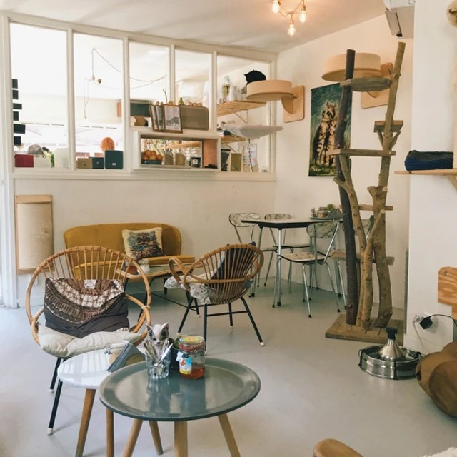 Ez egyébként egy cicás kávézó-reggeliző. Mentett cicák laknak itt, összesen heten vannak, de egyszerre általában csak három macsek van bent a kávézóban. A belépéshez fizetned kell 3 eurót, amit a macskákra fordítanak – állatorvos, macskatáp, játékok –, de adományokat is elfogadnak. Mielőtt bemész, le kell fertőtlenítened (adnak valami bigyót amivel kezet kell mosni), és néhány szabályt is be kell tartanod: nem etetheted őket, nem vakuzhatsz ha fényképezel (én inkább egyáltalán nem is fotóztam őket), illetve nem emelheted fel a kis szőrgombócokat.