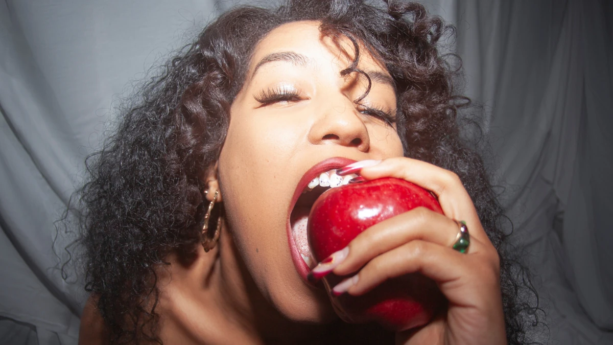 Dea biblikus metaforákkal dúsítja a problémakört — a tiszta lelkű Hófehérke, vagyis Éva leszakítja a fáról az almát, és megtörténik a bűnbeesés. Ám az alma nem a bűnösséget, hanem a tudást szimbolizálja jóról és rosszról — immár ismeri saját testét, értékét, az örömök árát.