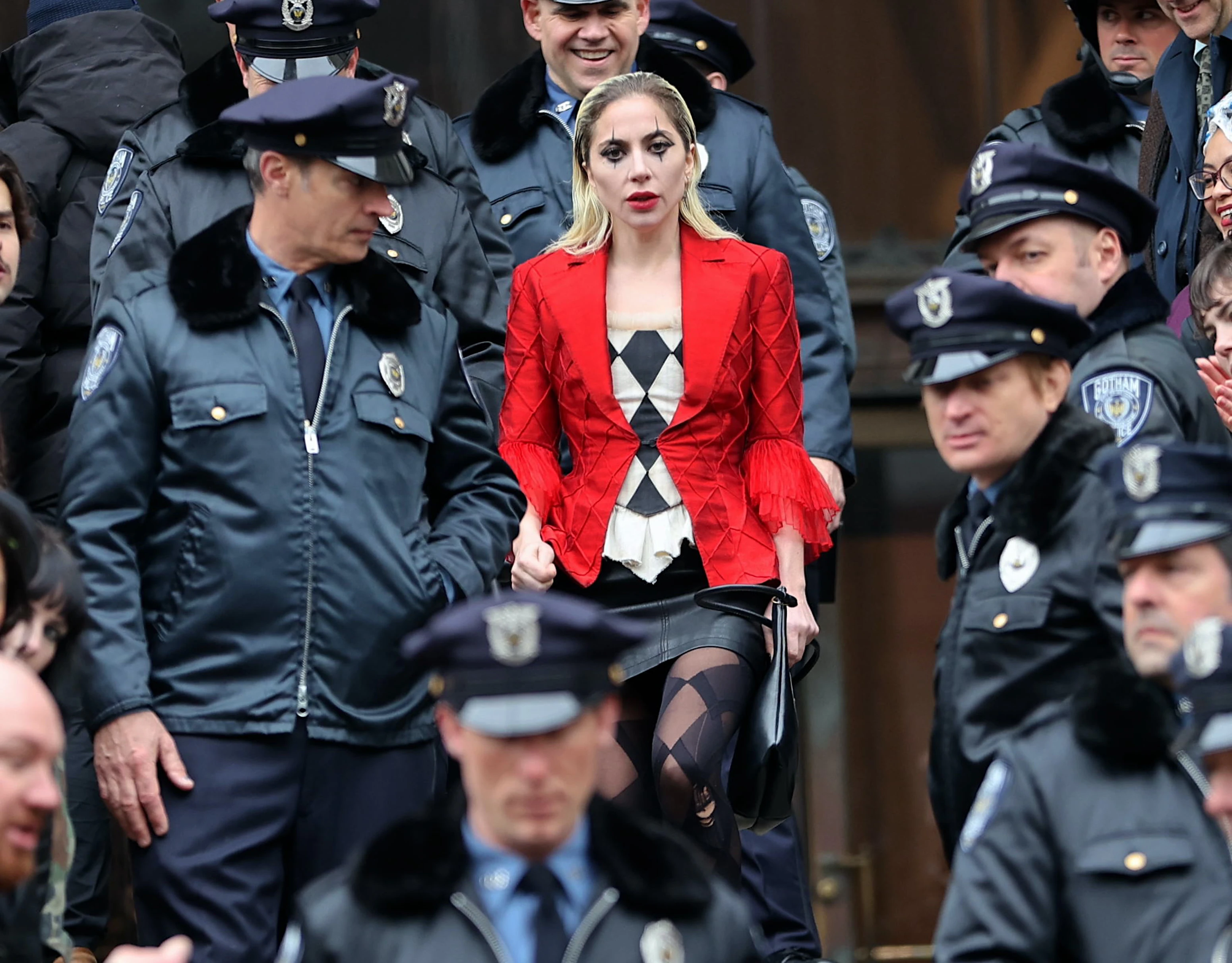 Ne feledjük azt a pillanatot sem, amikor egy elegánsabb bohóc szettben kísérik a színésznő karakterét a rendőrök, aki lezser eleganciával vonul át az őt körülvevő tömegen.
