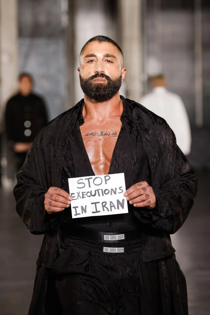 Az divatbemutató legerősebb pillanata azonban mégis csak az volt, amikor az egyik modell egy Stop executions in Iran, azaz Elég volt az iráni kivégzésekből feliratos táblával vonult végig a kifutón.