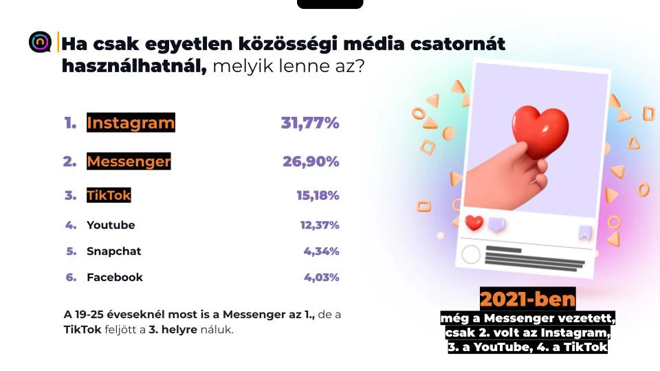 A megkérdezettek válaszai alapján a legtöbbet a Messengert használják, ezt követi az Instagram és a TikTok. Érdekes, hogy a 2021-es kutatás óta nem változott a sorrend, az viszont változott, hogy a Snapchat és az Instagram után a BeReal alkalmazás leverte a Facebookot abban a kérdésben, hogy melyik közösségi csatornára posztolnak a leggyakrabban. A válaszadók 35 százaléka több mint 30 influenszert követ, jellemzően magyar fiatalokat, akik csak online népszerűek, valamint külföldi sztárokat, akik más területen, például a tévében ismertek, és nőtt azok száma is, akik külföldi, csak online felületen népszerű fiatalokat követnek. 47 százalékuk vett már valamit amiatt, mert egy influenszer ajánlotta, de 69 százalékuk mondja azt, hogy az online megjelenő reklámok viszont zavarják, és mindig átugorja őket. 36 százalékuk válaszolt arra a kérdésre igennel, hogy szeretne-e ő is híres lenni az interneten. A klasszikus médiafogyasztás, mint a rádiózás, tévézés, de még az online hírportálok böngészése sem fért be a TOP10-be. Közösségi média posztok görgetése, YouTube videók nézése, Instagram story-k böngészése előzik be őket. Azoknál, akik 4 óránál többet neteznek, a TikTok a családi programok elé kerül az összesített rangsorban.