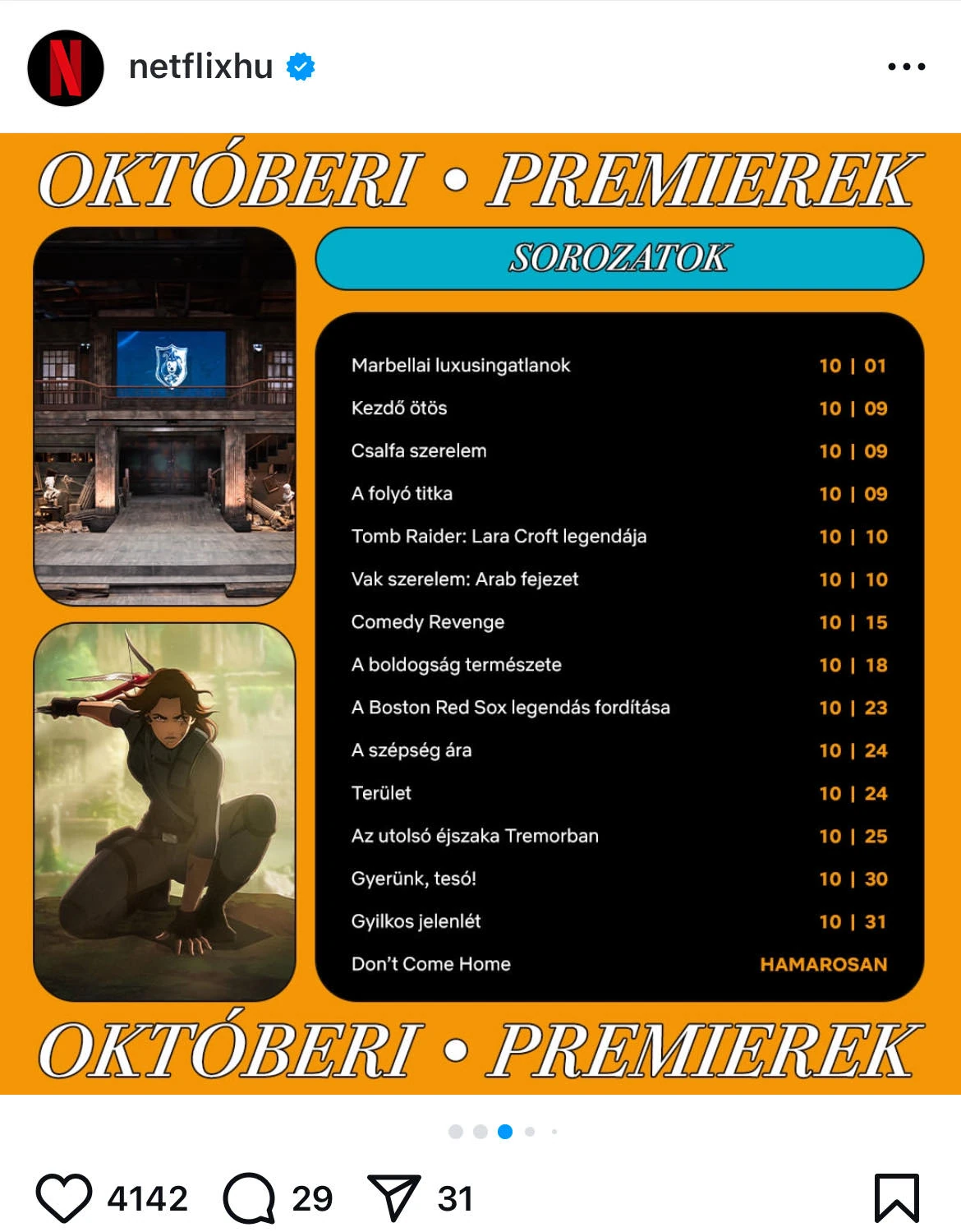Az októberi kínálatban számos újdonságokat is találhatsz. A Marbellai luxusingatlanok pont neked való, ha imádod a fényűző otthonokat, a Kezdő ötöst pedig biztos szeretni fogod, ha sportrajongó vagy A Csalfa szerelem az érzelmi bonyodalmak és a megcsalások világába kalauzol el, A folyó titka pedig egy rejtélyekkel teli történet, amelyben feszültségből és borzongásból bőven kijut. A Vak szerelem: Arab fejezet is csak rád vár majd, a Tomb Raider: Lara Croft legendáját pedig biztosan nagyon várod már, ha szeretnéd animációs akciósorozat formájában is végigizgulni kedvenc karaktered kalandjait.