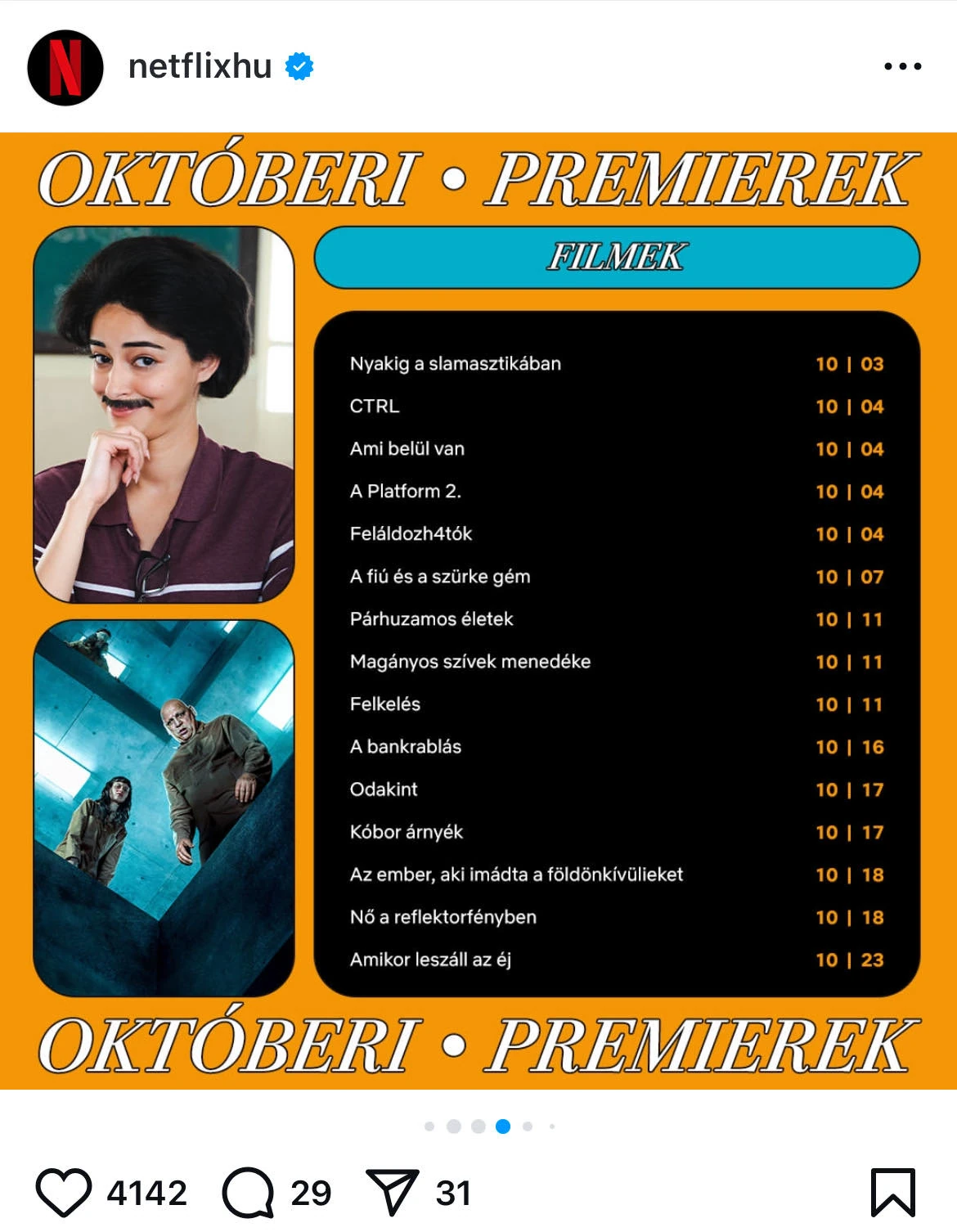 Filmek tekintetében sincs okunk panaszra, ugyanis ebben a hónapban is lesz minden, mi szem-szájnak ingere: akció, dráma, thriller, romantika. A Nyakig a slamasztikában október 3-án debütál és véget nem érő nevetést kínál, A Platform 2 a kultikus thriller folytatásával borzolja majd a kedélyeket, a Párhuzamos életek pedig egy elgondolkodtató és mélyérzelmű dráma, amire szintén van miért várni. Ha pedig egy lendületes akciófilmre vágysz, akkor október 11-én a Felkelés című film lehet majd a tökéletes esti program.