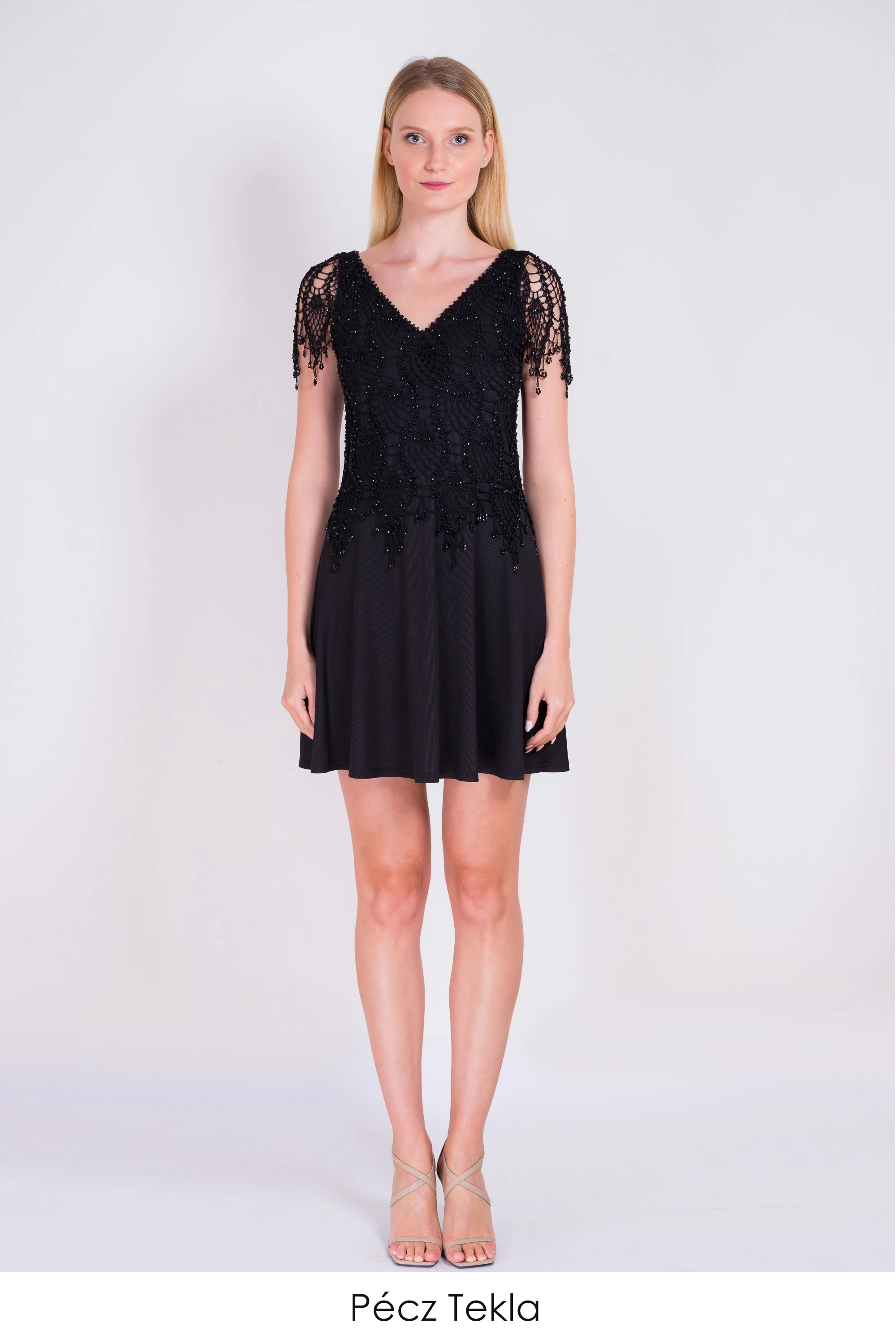 A pályázat koncepciója nagyon közel állt hozzám, inspiráló volt számomra, hogy régi ruhadarabokból kellett újat alkotnom. Sokáig gondolkodtam, mire megszületett a fejemben a végső koncepció. Egy fekete ruhából és egy gyöngyös, horgolt felsőből született meg a pályamunkám. A végeredmény egy különleges, tökéletes vonalvezető, újragondolt ruhadarab lett.