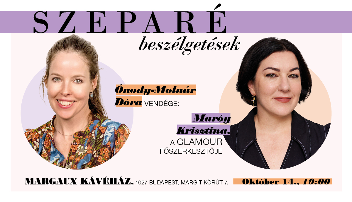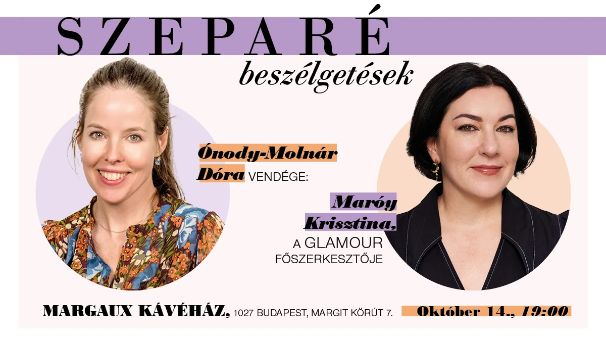 A Szeparé beszélgetések következő estjén, október 14-én 19 órától a Margaux kávéházban a budapesti Margit körúton Maróy Krisztina, a GLAMOUR főszerkesztője és Ónody-Molnár Dóra újságíró ülnek le egy őszinte, mély beszélgetésre. Szó lesz karrierről, női sorsokról, médiáról és arról, hogyan maradhat hiteles valaki több évtizedes szakmai pálya után is. Egy olyan esti program vár, ahol inspiráló történetek és emberi pillanatok várják a hallgatóságot.