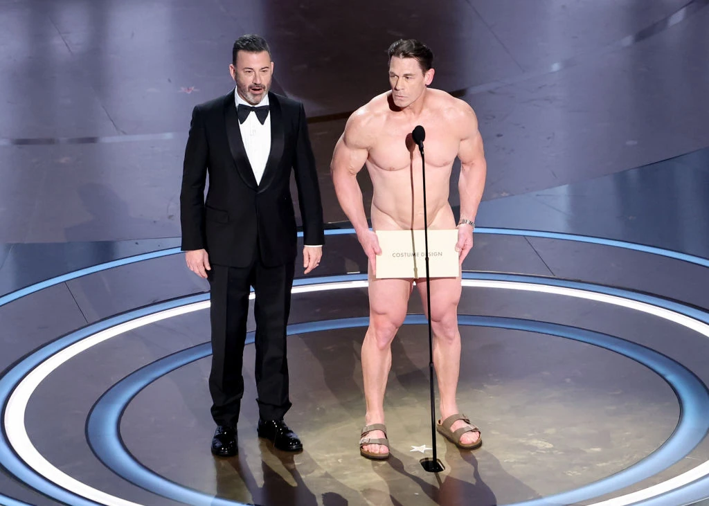 És akkor az Oscar történetének egy vicces pillanatát idézve (1974-ben Elizabeth Taylor színpadra lépése közben átrohant egy pucér pasi a színpadon), megjelenik a szanaszét gyúrt, pucér John Cena színész-birkózó, hogy átadja a legjobb jelmezért (értitek, pucéron jelmezért, haha) járó díjat.