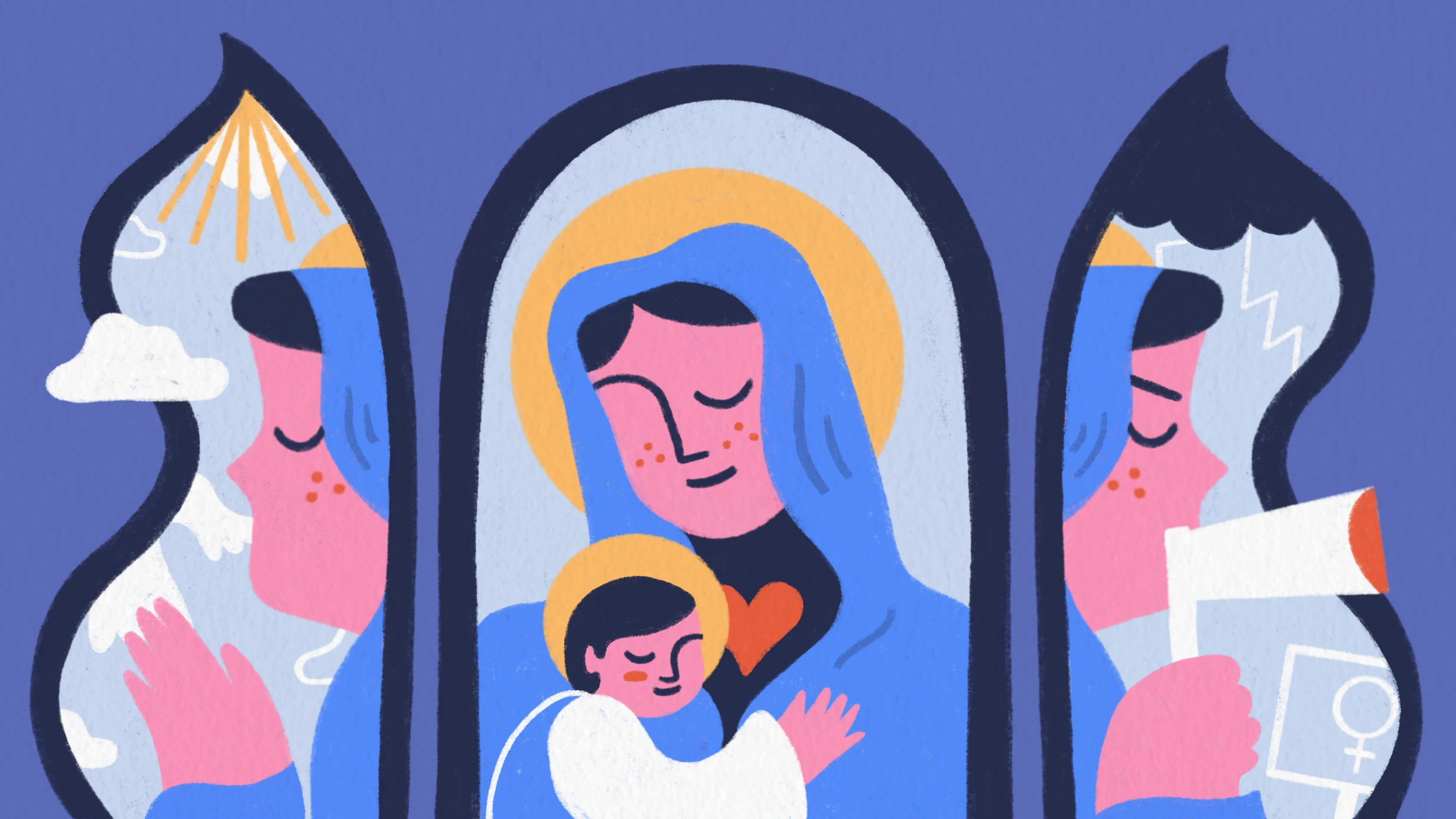 Ha Szűz Mária vallásos ábrázolásaira gondolunk, általában egy kék-fehér ruhába burkolózott, áhítattal az ég felé néző, kisfiát ölelő vagy felnőtt fiát sirató nőalak jut eszünkbe. Mit árul el ez Mária szerepéről a keresztény vallásban?