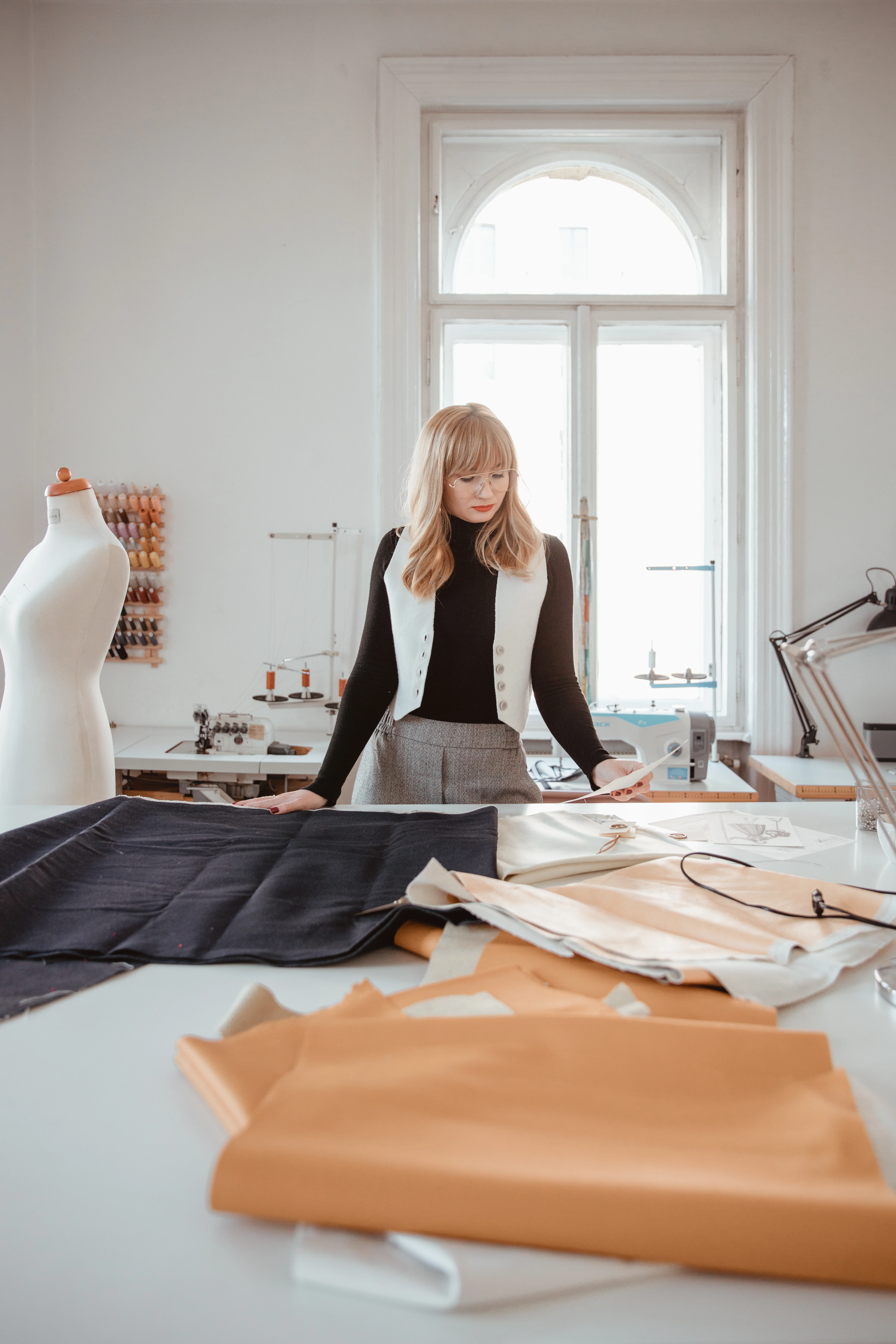 Az anyagokat mindig én magam választom ki személyesen, ezt a fázist kifejezetten szeretem. Számomra egy textil üzlet maga a mennyország. Fontos, hogy az Európai Unióban készüljenek az anyagok, hogy minél kisebb legyen a szállítás és a karbonlábnyom. Kedvenc jacquard és brokát anyagaimat mindig Prágából hozom, mert sajnos Magyarországon ilyen magas minőségű textíliákkal még nem találkoztam. Az anyagösszetétel mellett a minőség és a karbantartás is döntő szempont nálam.