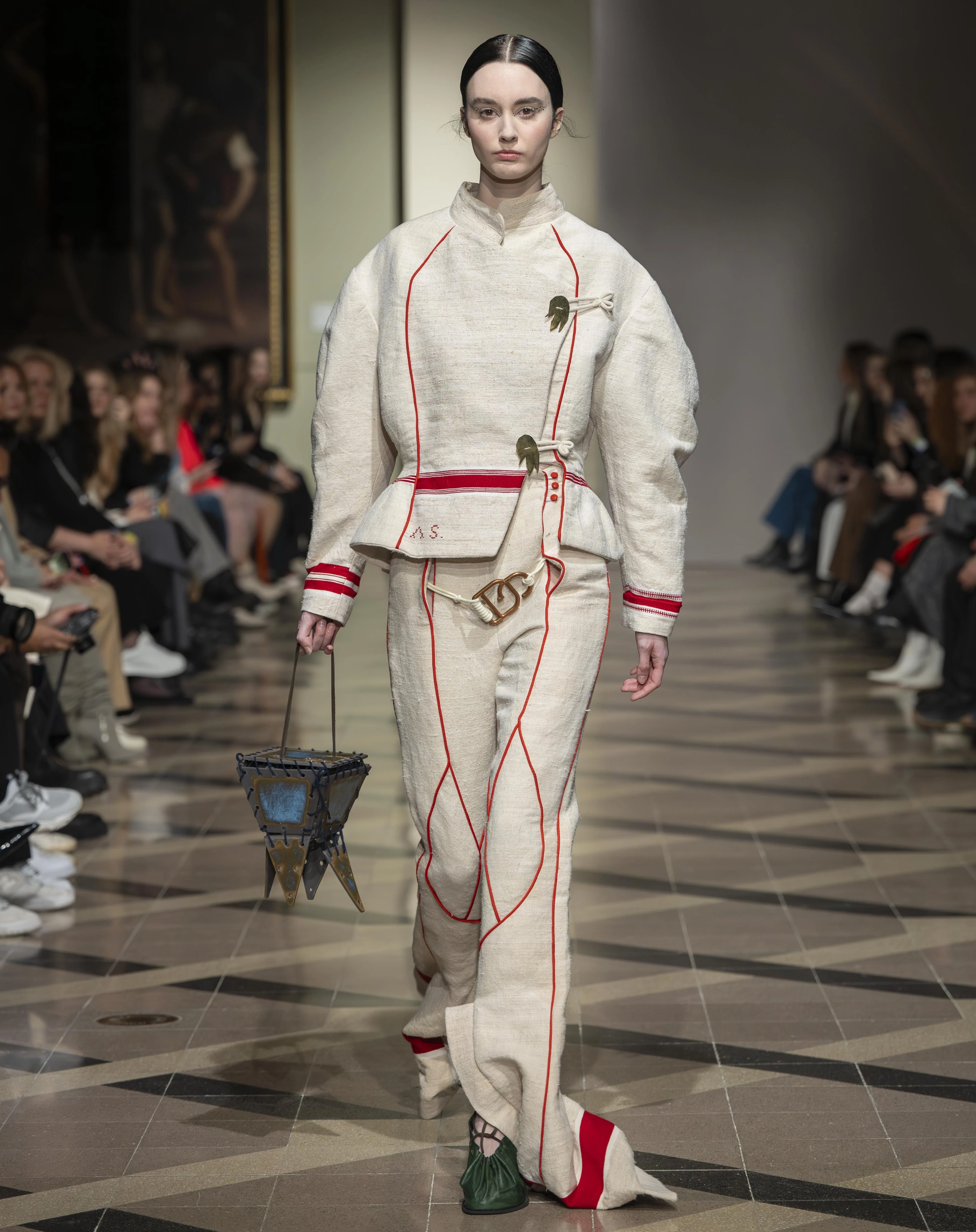 Igen, van a kollekcióban egy len öltönyszerű szett, ami a dédszüleim házkörüli lenjéből készült, törölköző- és ágytakaró-textilekből. Ennek a sziluettje a népmesékben látható herceg kerekded, széles vállát és karcsú derekát idézi. A nadrág tulipánszabású.