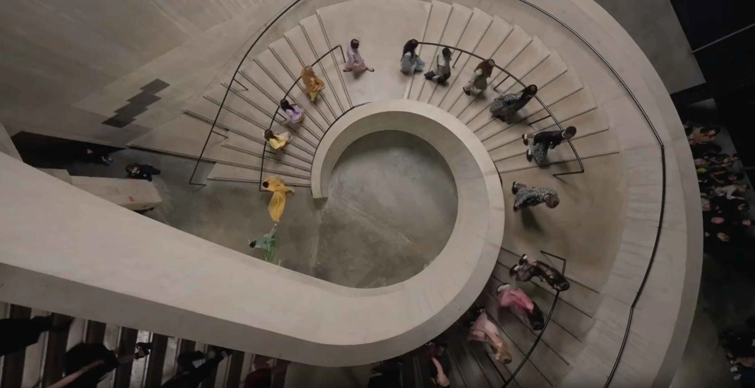 A bemutató későbbi pontján a modellek a Tate ikonikus csigalépcsőjét vették birtokba, amelynek homogén, finomcement anyagától gyönyörűen elkülönültek a színes ruhakompozíciók.