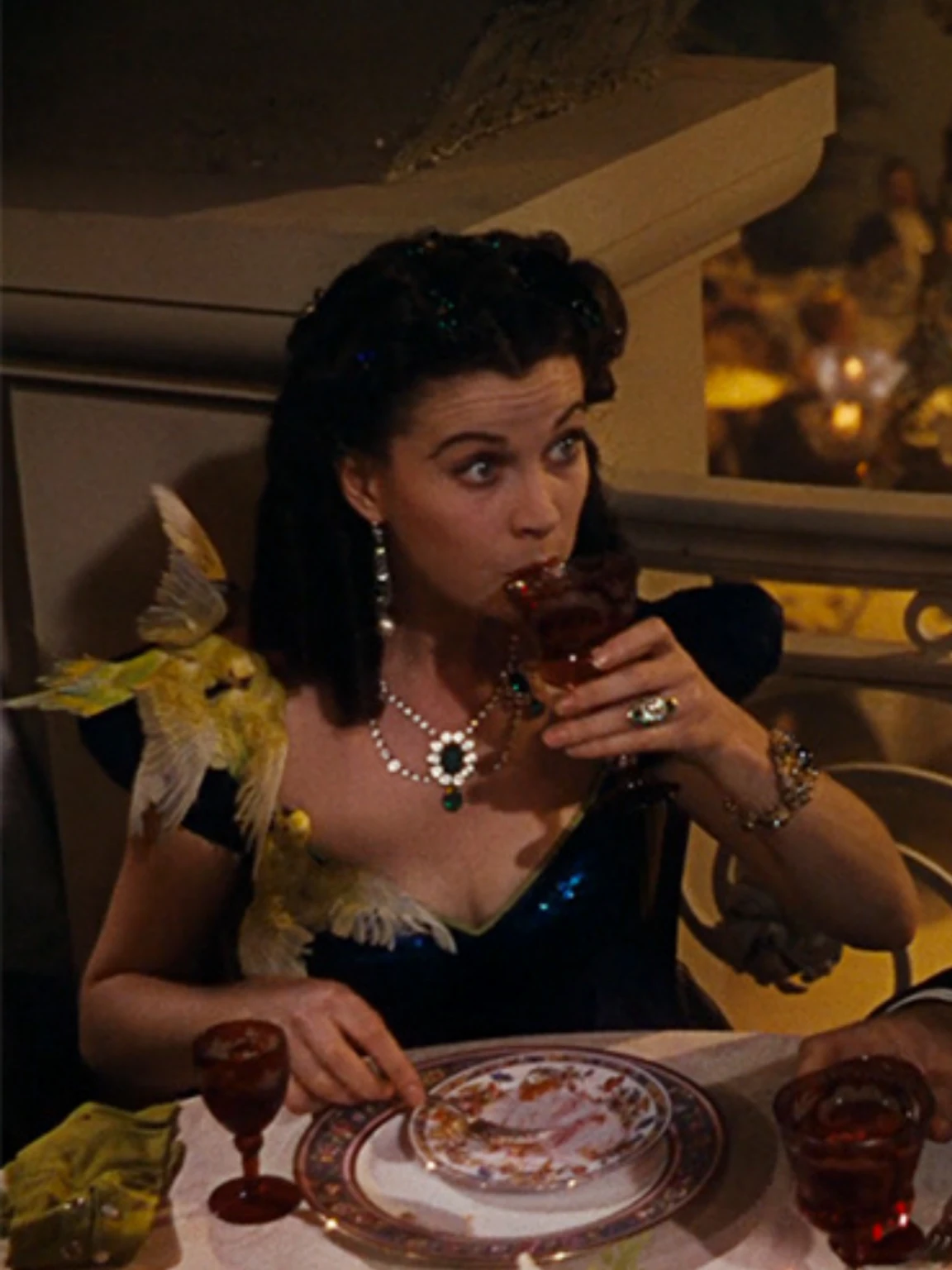 Bár kinek ne imponálna egy smaragdokkal körülölelt, négykarátos gyémántgyűrű, amely már-már a gyűrűsujjunk teljes felületét beteríti? A palackszín egyébként gyönyörűen vissza-visszaköszön a film különböző pontjain: akár az említett ruhák, a látványos gyűrű, vagy akár a Scarlettet megszemélyesítő színésznő, Vivien Leigh szemének zöld csillogásában.