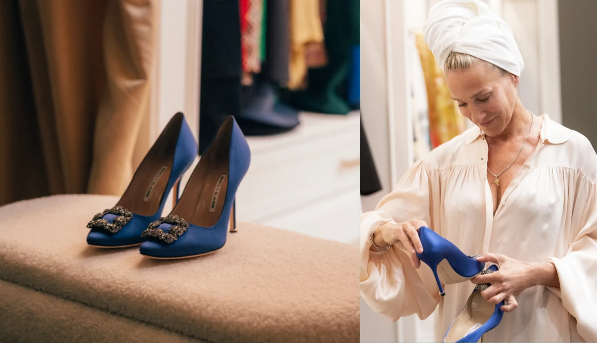 Persze, a filmek legklasszikusabb leánykérő jelenete tagadhatatlanul a korábbi cikkünkben említett királykék, csatos ’Hangisi’ típusú Manolo Blahnikjával történt, amelyet a második epizódban egy Mr. Bigtől kapott, négy karommal rögzített, monumentális, kerek, éjkék-fekete brillcsiszolat sem tudott lekörözni.