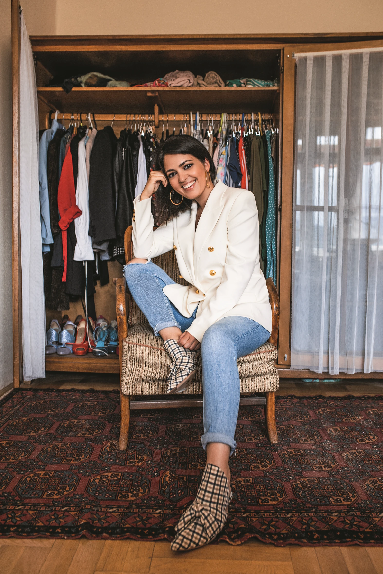 Réka a táskáit szintén könnyen elérhető, bár kissé szokatlan helyen tartja. „Erre most egy fotelt használok. Nem a leghelytakarékosabb megoldás, de sosem szoktam ott ülni. Az alkalmi táskák pormentesen, textilzsákban vagy dobozban, polcon vannak.” Réka az alkalmi cipőit, táskáit használat után, a gyakran viselt darabokat használat előtt tisztítja meg.