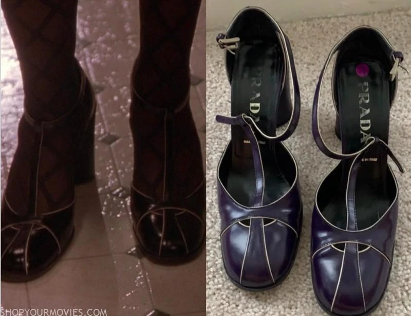 Ugyan a legtöbb szakcikk Elle Woods szívpántos telitalpúját (amelyet a Dolls Kills divatmárka azóta ügyesen rekreált), vagy éppen köves-csatos pink patent szandálját emeli ki, mi sokkal inkább az első tárgyalás során viselt leértékelt Prada topánkára fókuszálnánk. A vastag sarkú, T-szíjas, krémfehér szegéllyel fűszerezett sötétlila Mary Jane-t az ügyvédjelölt főhősnő egy rombuszmintás fekete harisnyával és egy decens, tetőtől-talpig fekete kiskosztümmel viselte, amelyet pár finom, piros részlettel bolondítottak a film jelmeztervezői.