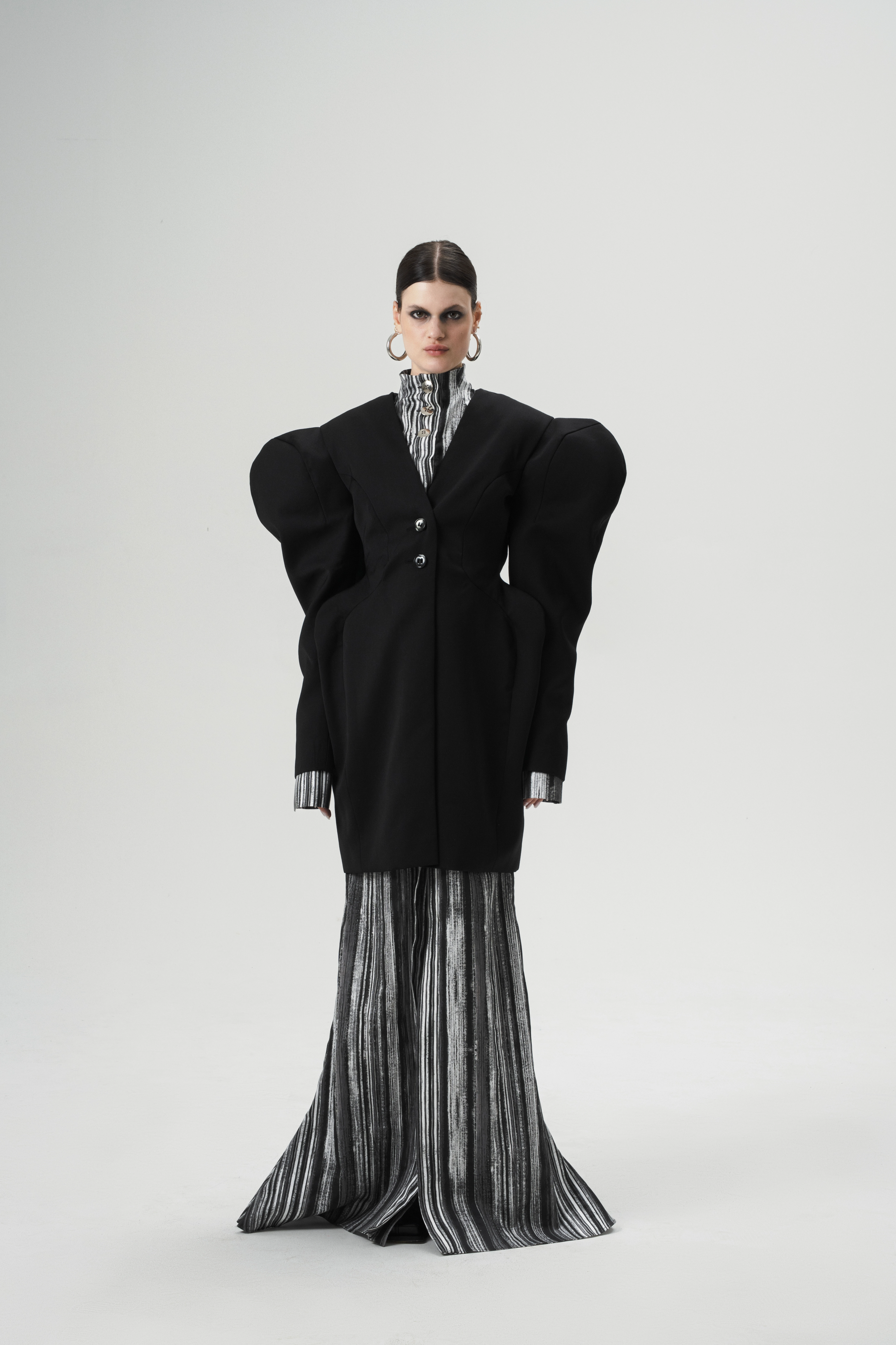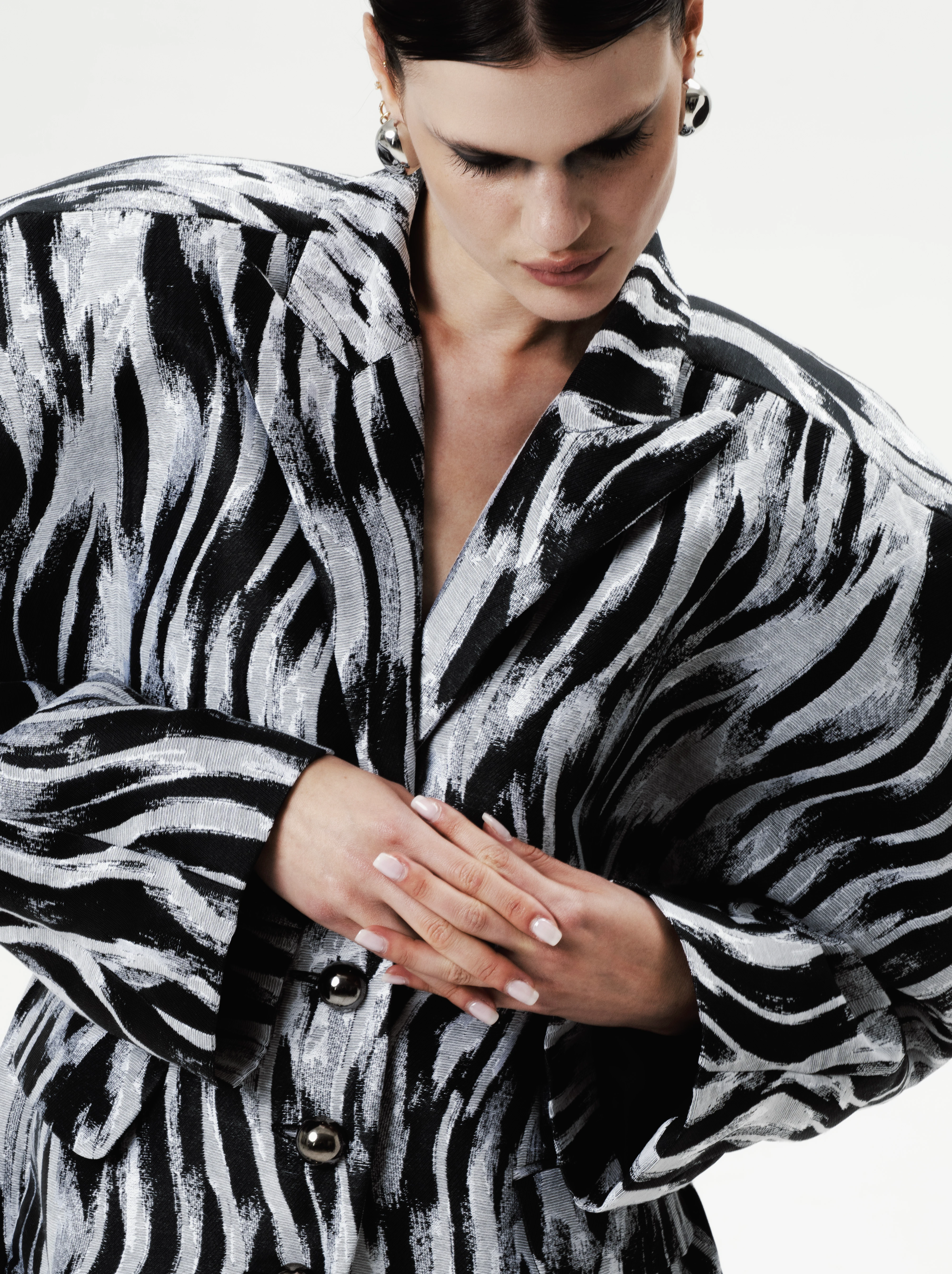 A blézerek és kabátok itt nem pusztán ruhadarabok, hanem páncélok, a belső tartás és stabilitás szimbólumai. A tradicionális öltönyanyagok mellé Réka saját tervezésű textíliákat társított, így hozva létre egy kollekciót, ami egyszerre elegáns és kíméletlenül őszinte.