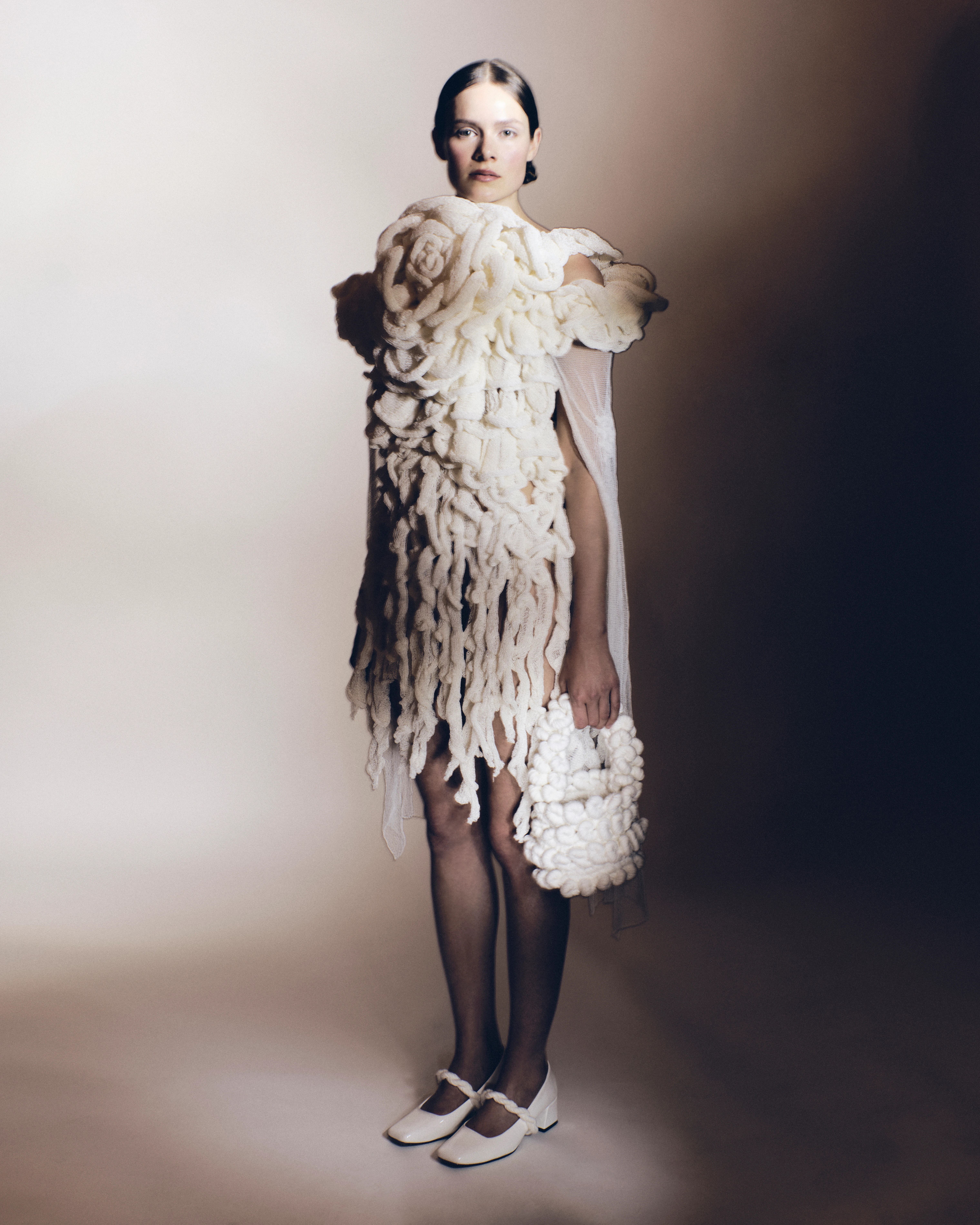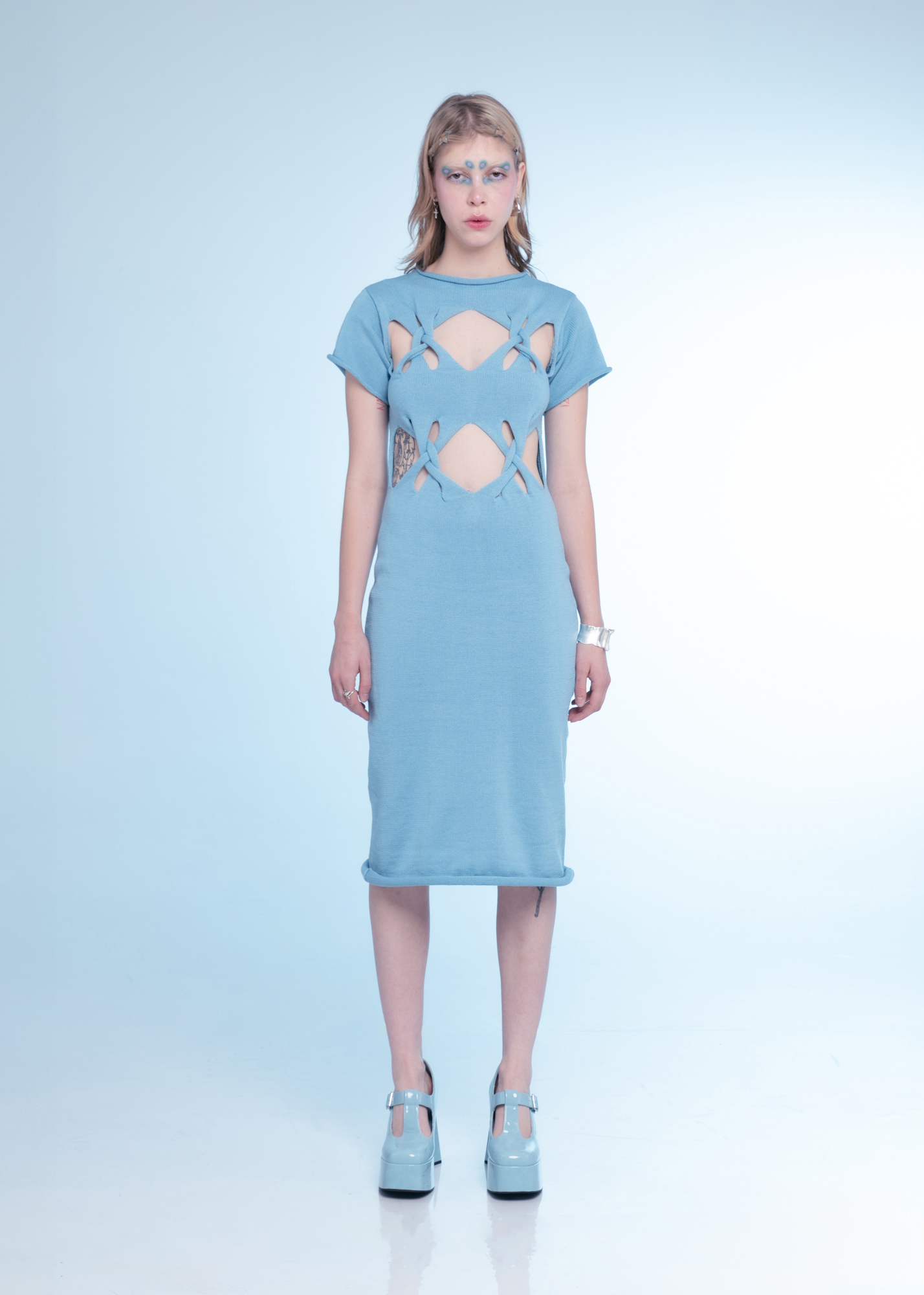 Tóth Eszter diplomakollekciója a 2000-es évek internetkultúrájából és az online kézműves közösségek világából merít. A Techne című sorozatban a kötés és horgolás klasszikus technikáit ötvözi a digitális esztétikával, létrehozva egy jövőbe mutató, mégis emberi textilvilágot.
