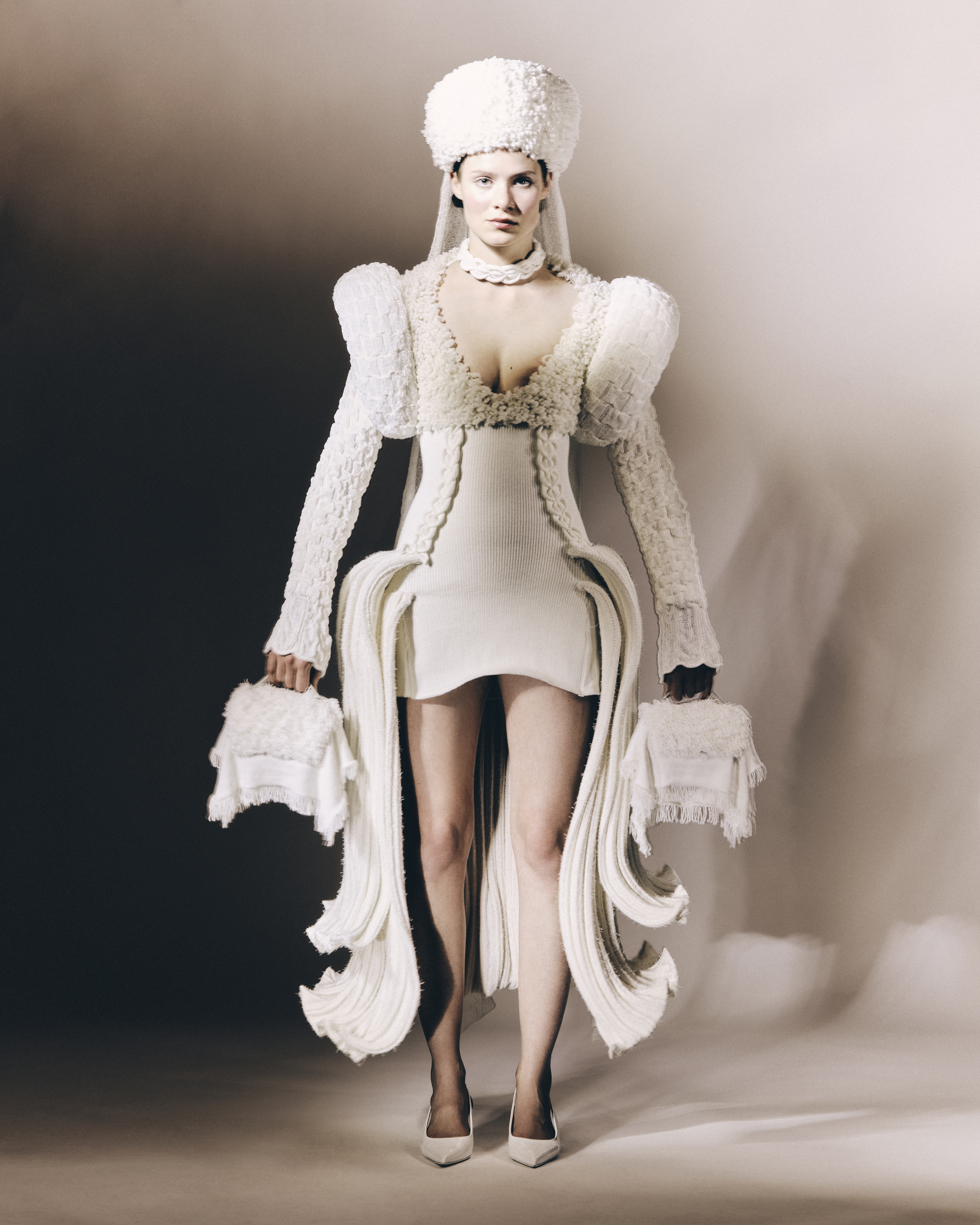 Kain Eszter kollekciója lírai és spirituális: a magyar néphagyomány fehér alakjait értelmezi újra, összekapcsolva őket egy fiktív női életút állomásaival. A Fejírben járok című munka kötött öltözékei a születéstől a halálig kísérik végig a női lét rituális pillanatait. A fehér szín itt nemcsak vizuális elem, hanem szimbólum, az átváltozás, a közösségi emlékezet és a tisztulás jelképe.