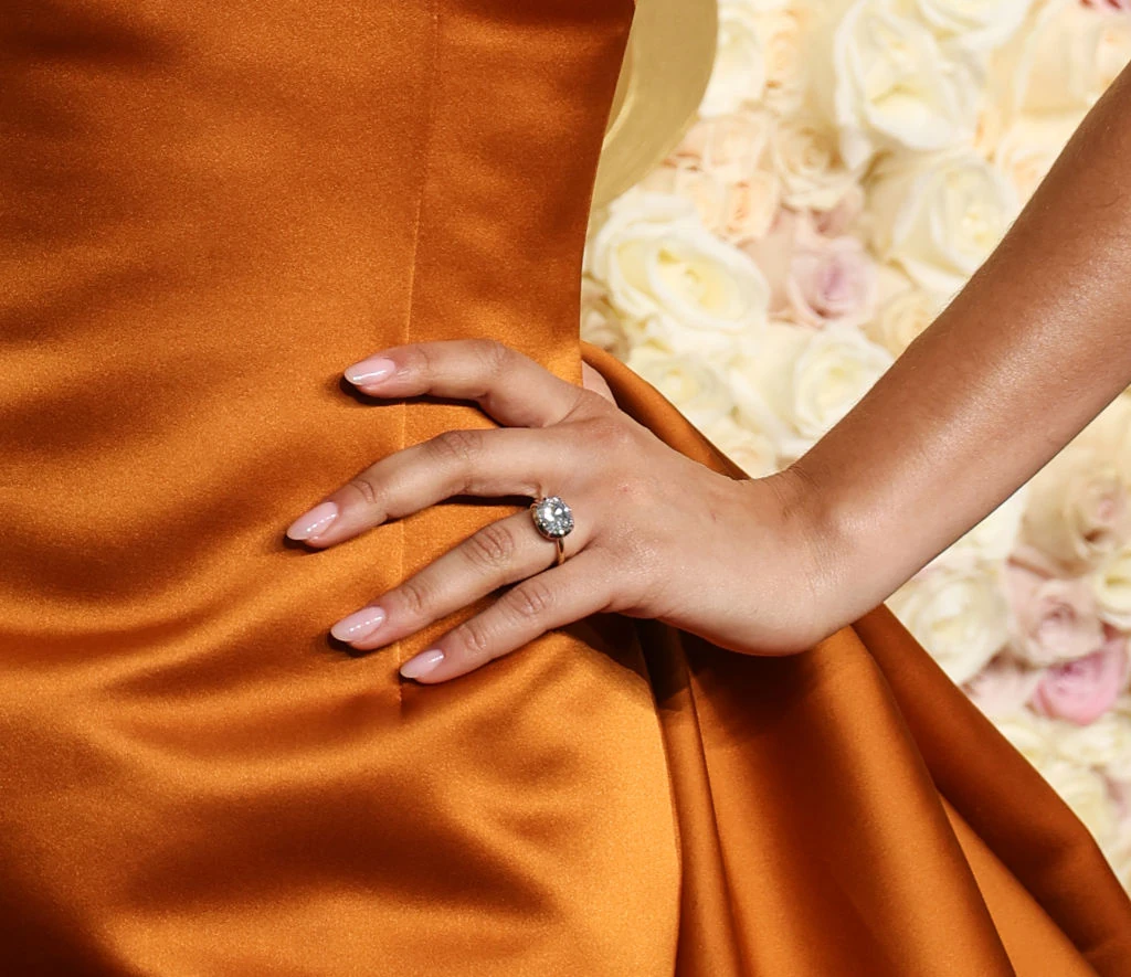 Az ékszercsokor legfényesebb darabját azonban nem a római luxusmárkának, vagy épp Law Roach-nak köszönhette Zendaya, hanem újdonsült vőlegényének, Tom Hollandnek és Jessica McCormack angol ékszertervezőnek. Az ötkarátos, cushion csiszolású gyémánt egy Georgia-stílusú, vésett, fehérarany, fektetett elrendezésű bezelfoglalatban kapott helyet, amelyhez egy egyszerű, 18 karátos sárga arany gyűrűsín csatlakozott.