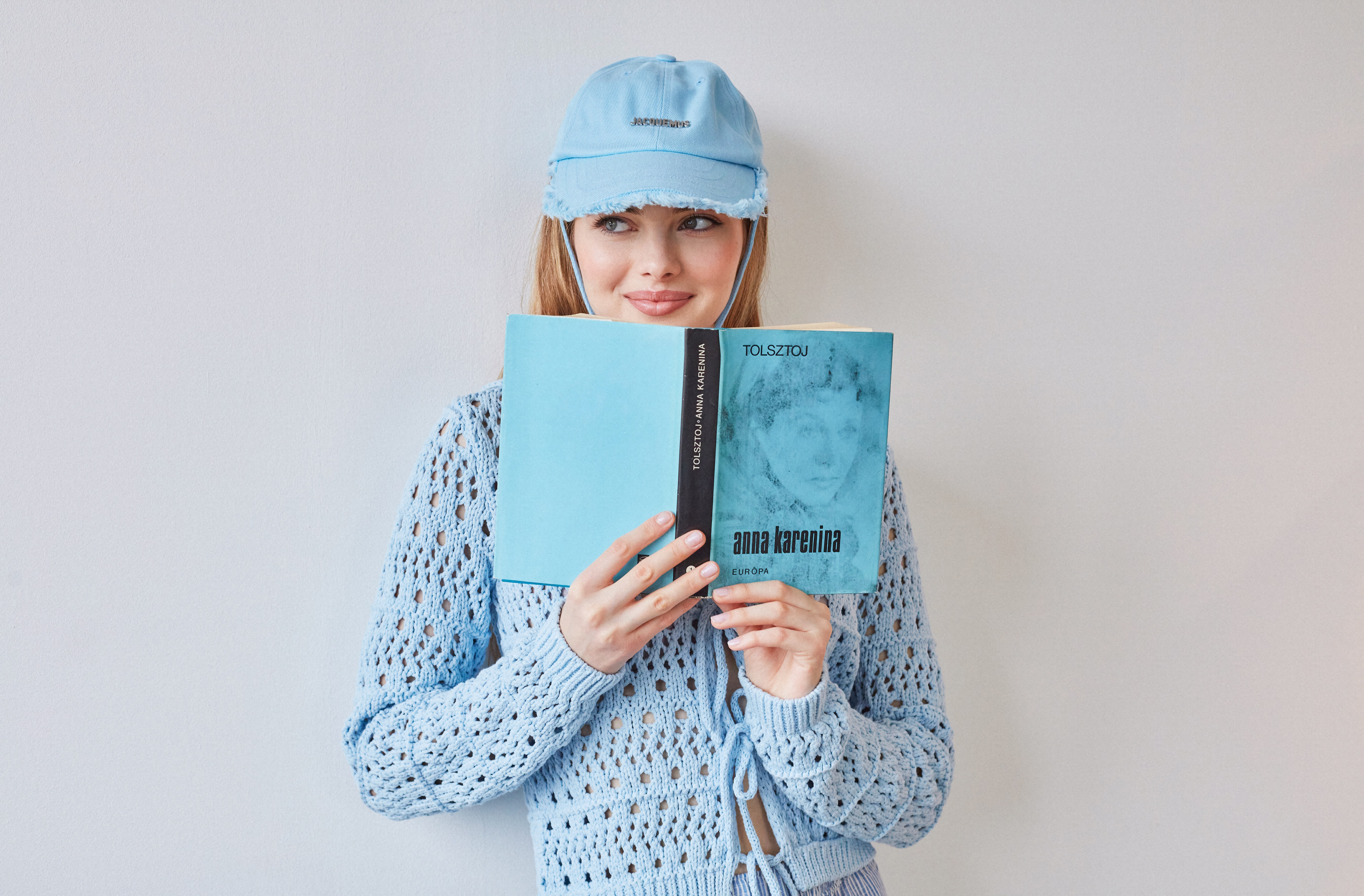 A gyors élmények korában élünk, mégis a lassú olvasás az, ami megtartja a kreativitásunkat és az empátiánkat - Kardigán GANNI, Baseballsapka JACQUEMUS