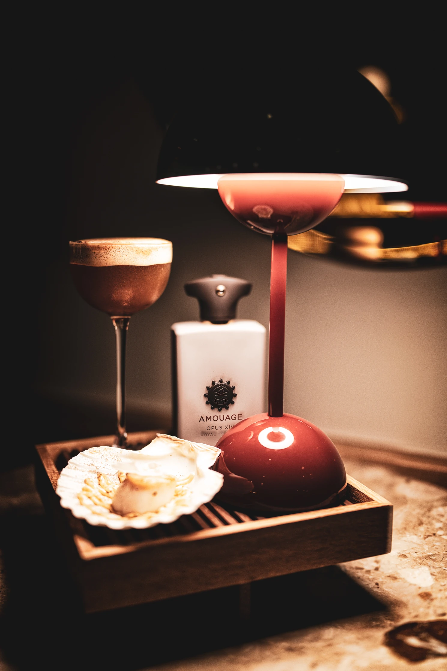 „Fontos volt, hogy minél közelebb tudjam hozni a vendégekhez az adott illatot mind illatában, koncepciójában és összetevőiben. Emellett szerettem volna megismertetni velük olyan extra fűszereket és anyagokat, mint például a saját agarfa-kivonatom, vagy akár a szintén házi készítésű, ibolyás cserzett bőr extraktom. Az illat szaglása és az ital ízlelése mellett pedig (a séfekkel egyetértésben) egy menüsort is megálmodtunk, hogy teljes ízorgiát élhessen át a vendég” – mesél a koncepcióról.