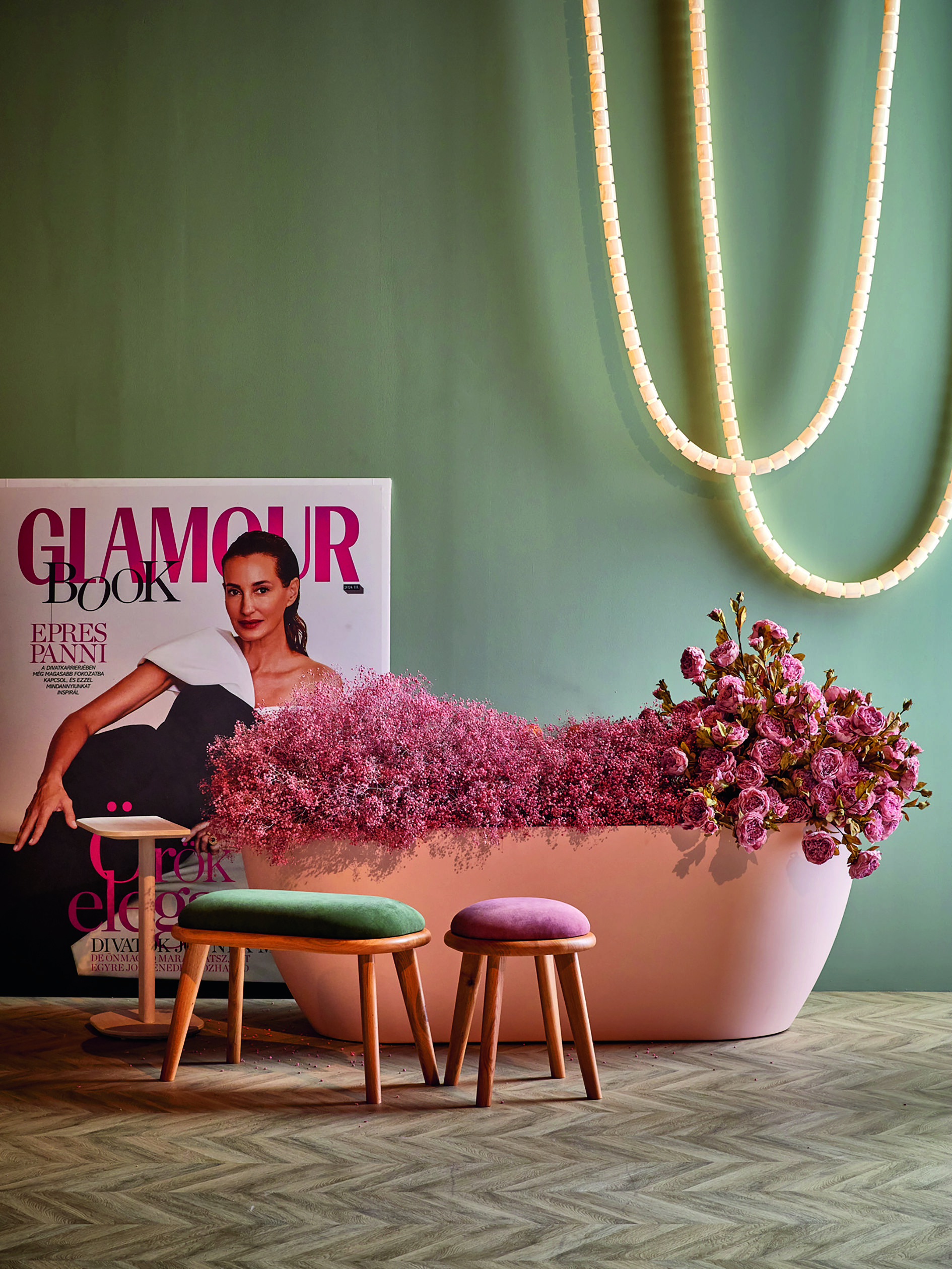 „A gigantikus gyöngysorokat jelképező lámpák, a porcelánrózsaszín, szabadon álló kádban elhelyezett dús növénykompozíció meghatározó elemei váratlan, szimbolikus elemekként gazdagították a teret” – meséli Renáta. A térben elhelyezett még egy, direkt az eseményre tervezett ruhasztendert is, amelyen Zoób Katti ruhakölteményei sorakoztak, ezzel invitálva a látogatókat, hogy fedezzék fel az ikonikus tervező darabjait. Renáta szerint a személyes élmény ki emelten fontos a lakástrend-bemutatókon, mert ezek során válhat „emberléptékűvé” a sokszor elrugaszkodottnak tartott dizájn és luxus.