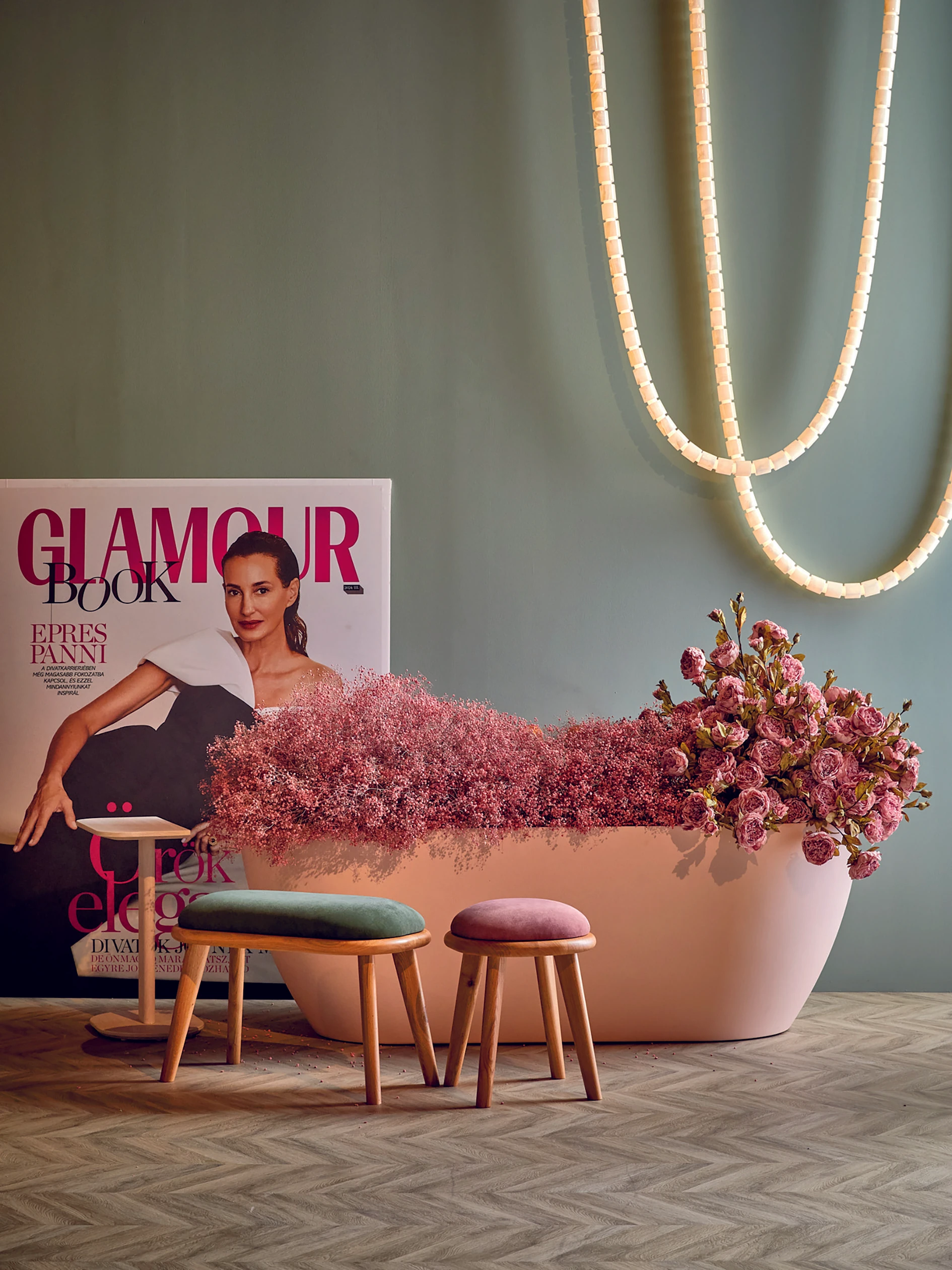 „A gigantikus gyöngysorokat jelképező lámpák, a porcelánrózsaszín, szabadon álló kádban elhelyezett dús növénykompozíció meghatározó elemei váratlan, szimbolikus elemekként gazdagították a teret” – meséli Renáta. A térben elhelyezett még egy, direkt az eseményre tervezett ruhasztendert is, amelyen Zoób Katti ruhakölteményei sorakoztak, ezzel invitálva a látogatókat, hogy fedezzék fel az ikonikus tervező darabjait. Renáta szerint a személyes élmény ki emelten fontos a lakástrend-bemutatókon, mert ezek során válhat „emberléptékűvé” a sokszor elrugaszkodottnak tartott dizájn és luxus.