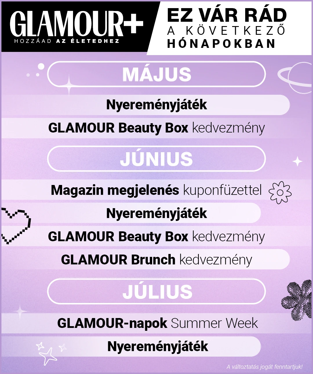 2026. április 1. - 30.Április a kiteljesedésről, a stílusos megújulásról és a tavaszi pörgésről szól! Segítünk, hogy a tavaszi napokat ne csak átéld, hanem valódi élményekkel és tudatossággal töltsd meg. Töltődj fel és ragyogj GLAMOUR Plusz előfizetőként – mutatjuk, milyen különleges kedvezményekkel, országos roadshow-val és exkluzív tartalmakkal tesszük felejthetetlenné a hónapodat!