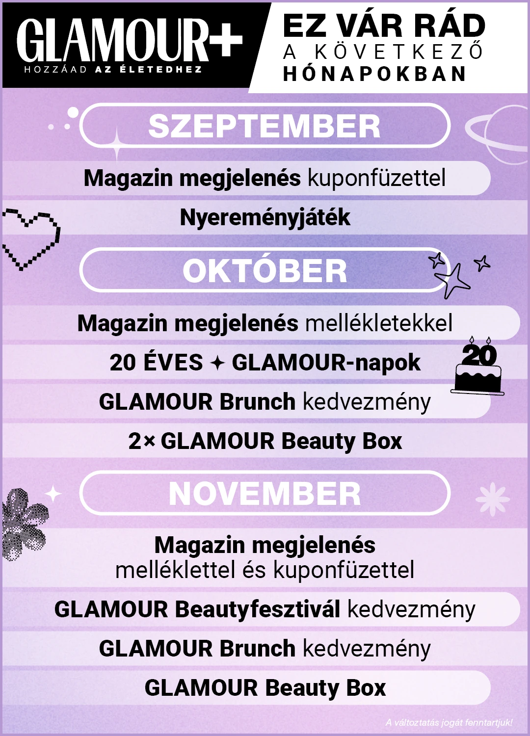 Továbbá előfizetőként eléred a GLAMOUR magazin aktuális és korábbi digitális kiadásait, megkapod az idén ötször megrendezésre kerülő GLAMOUR-napok kuponjait, valamint nyereményjátékokkal és további izgalmas eseményekkel várunk. Mindemellett egyedi kedvezményt szerezhetsz a GLAMOUR Beauty Boxokhoz.
